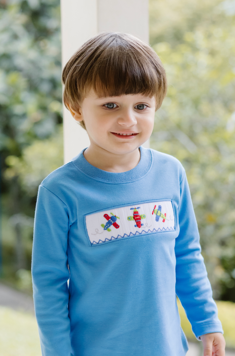 Airplane Smocked Harry Play Tee, Periwinkle Knit