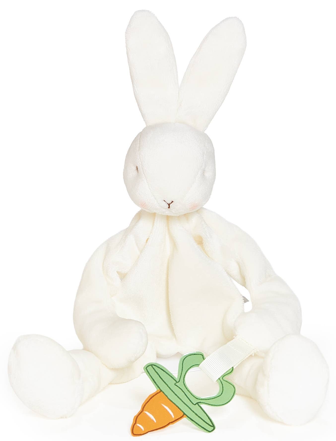 Bun Bun Bunny Silly Buddy animal pacifier holder is the perfect gift for your wee one with multiple ways to soothe. A classic gender-neutral white bunny favorite. Super-soft and floppy, super silly, and oh so useful, this take-a-long pal will tie onto baby's stroller, crib, or car seat. Soft white velour with pacifier holder hand loop and fun rattling head, this is sure to be a favorite security item of baby and Mom and Dad alike! Signature three carrot tag for little one's fingers, super-soft fabrics, and embroidered details.