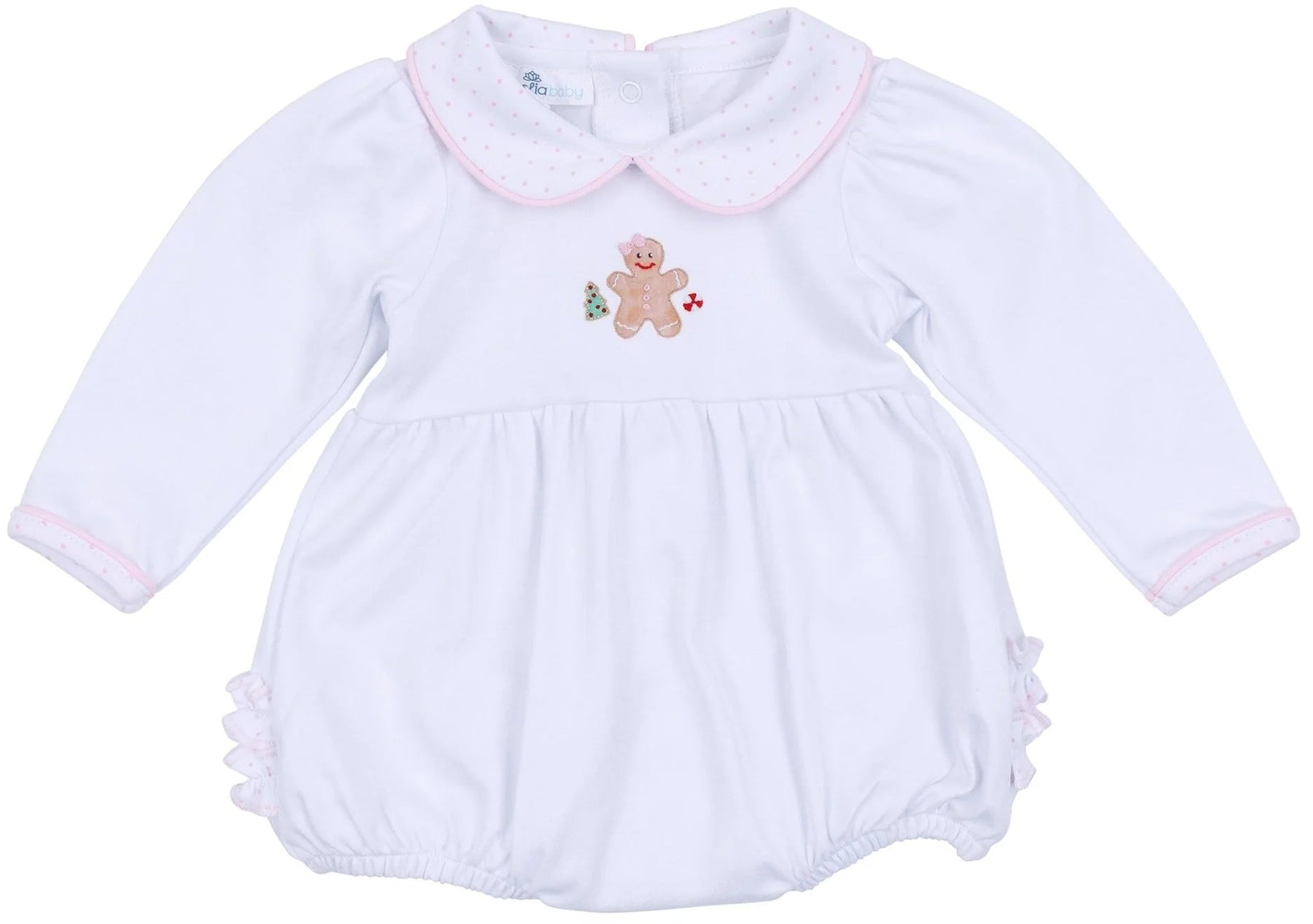 Celebrate the Christmas season in this delightful long sleeve bubble, crafted from luxurious Pima Cotton. It features a gingerbread girl and is accented with a delicate pink embroidered collar and ruffles, providing a charming and cozy outfit for cooler days.