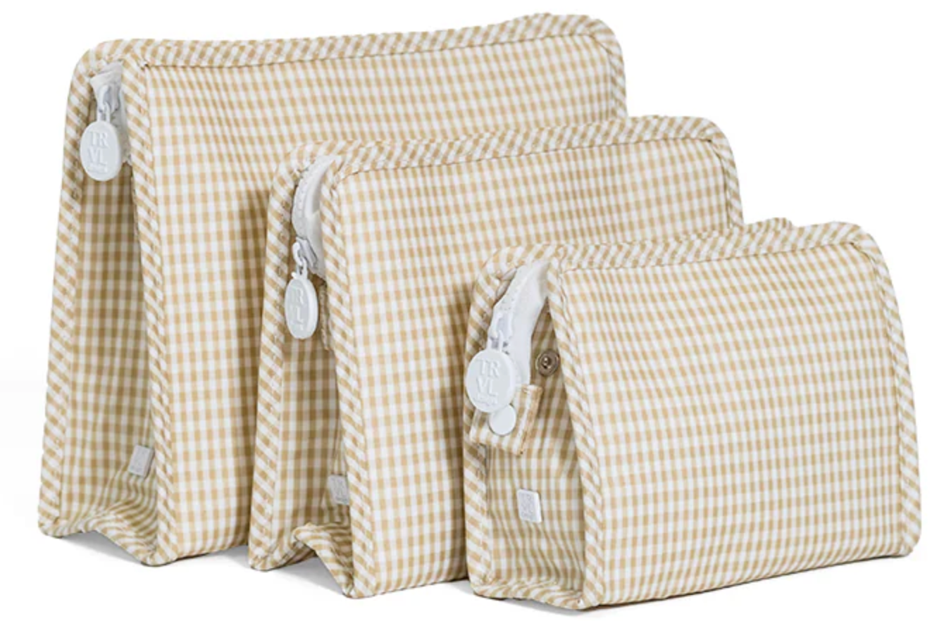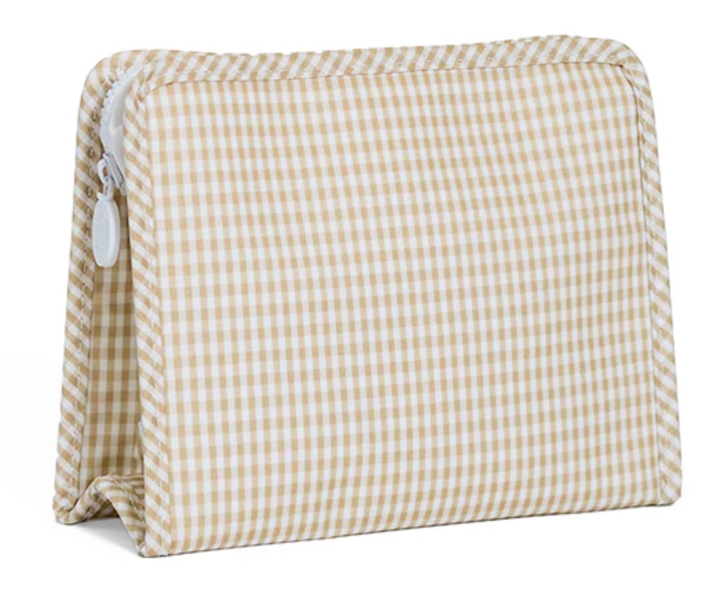 Our best-selling Roadies are our BFFs in the pouch world! Available in 3 sizes, our Medium Roadie is made in a cotton gingham with a thin Eco-friendly matte coating, an inside slip pocket and exterior snap open zip tabs for a wider opening and an easier access.