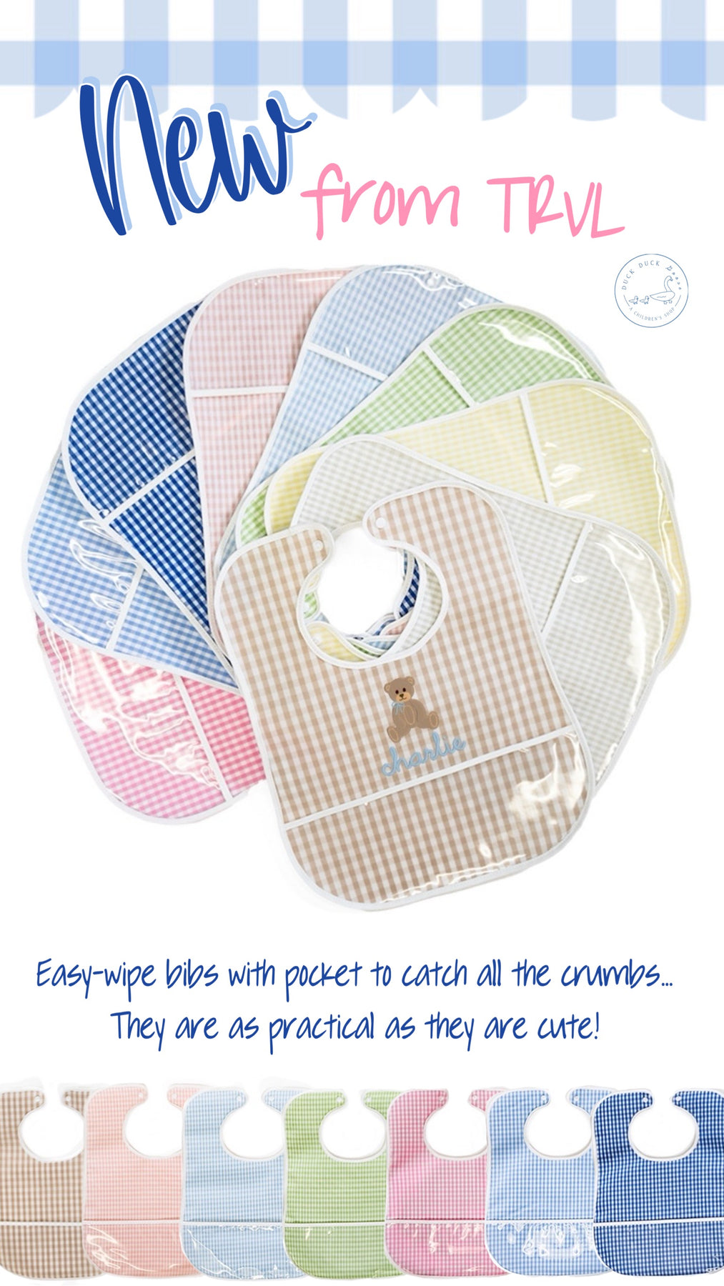 Your little ones will look super cute at meal and snack time with our Clean Up Bib. Our full coverage bib snaps at the back of the neck and has two front pockets to catch crumbs. These are made in our signature material that can be easily wiped clean. Comes packed in a cute cotton drawstring bag for easy display and storage.