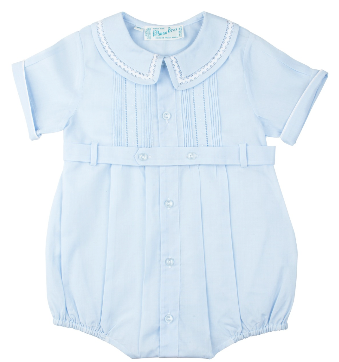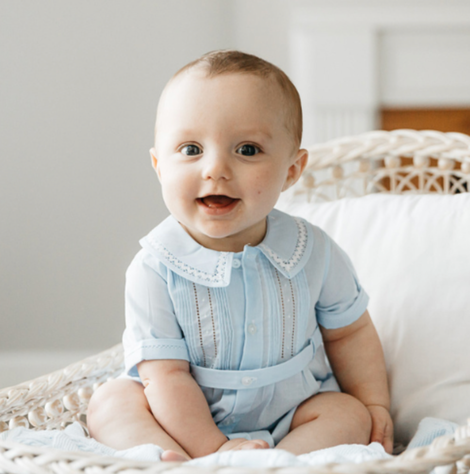 A sweet little creeper for your sweet little boy! This beautiful and classy baby outfit is made out of soft white and blue colors with ric rac trim and fagoting inserts on the collar for a beautiful detailed look. The bodice features hand tiny hand stitched pintucks, rows of boring, and sweet little dot embroidery. A tuxedo style belted waist, button down front, and sharp pleats give this piece its heirloom and vintage look. Opens with snaps at the crotch for easy changing convenience. For special occasions, holidays, or everyday classy layette to make your little one look and feel special!