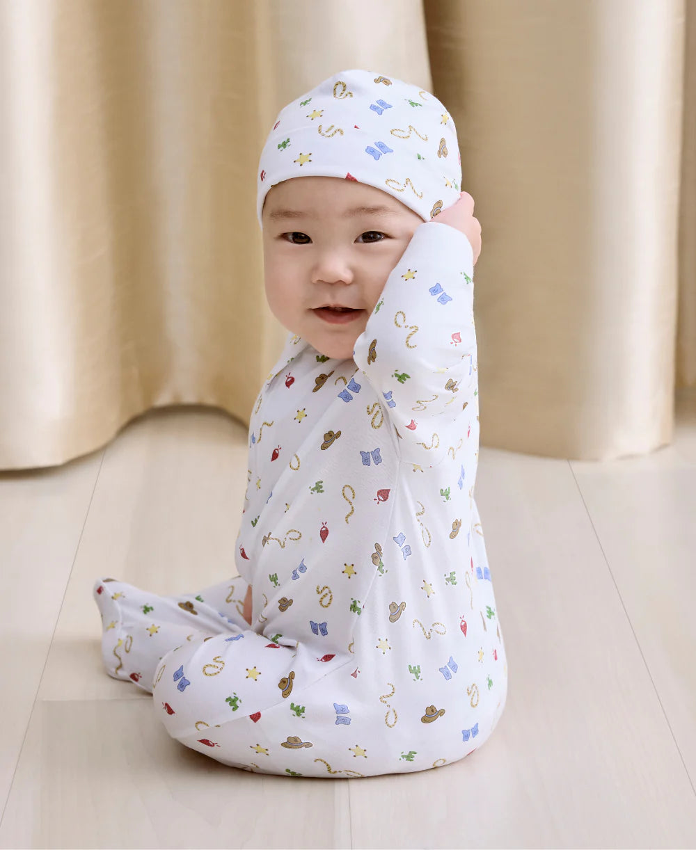Playfully patterned with our western cowboy print, our cozy, zippered footie for your precious baby is made from the softest Pima cotton for ultimate comfort.
