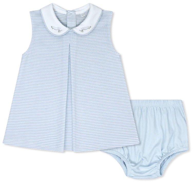 Full of playful charm, the Collier Diaper Set in Palmer Blue Stripe knit is a sweet and comfy choice for your little one. The sleeveless top features a crisp white Peter Pan collar with adorable caterpillar embroidery, adding a whimsical touch to this classic style.