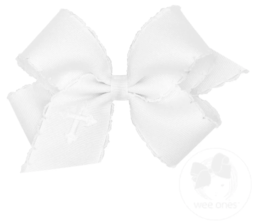 She’ll look heavenly with our white grosgrain hair bow! Our white moonstitch edge and cross embroidery on the tail give it a unique edge for any special occasion—perfect for Baptism, First Communions, Easter, and more! This bow is sure to stay in her hair all day with our patented WeeStay™ no-slip hair clip.