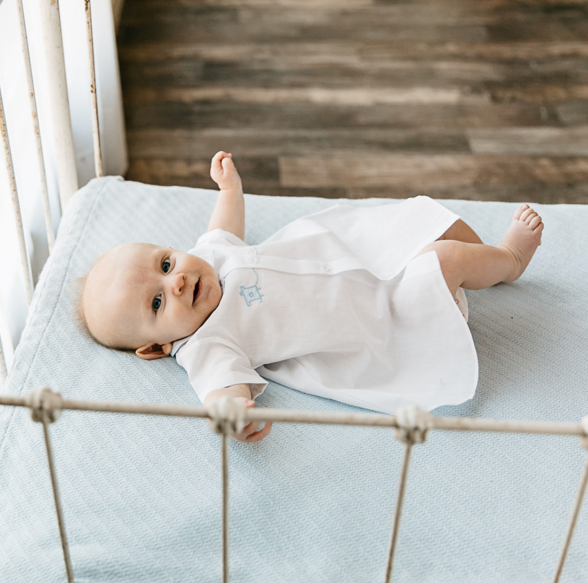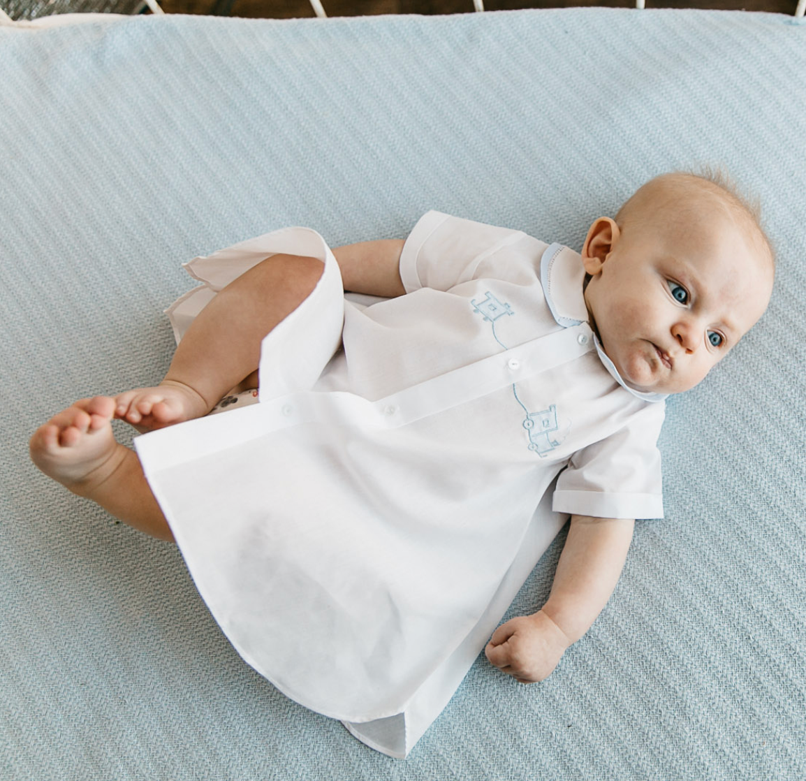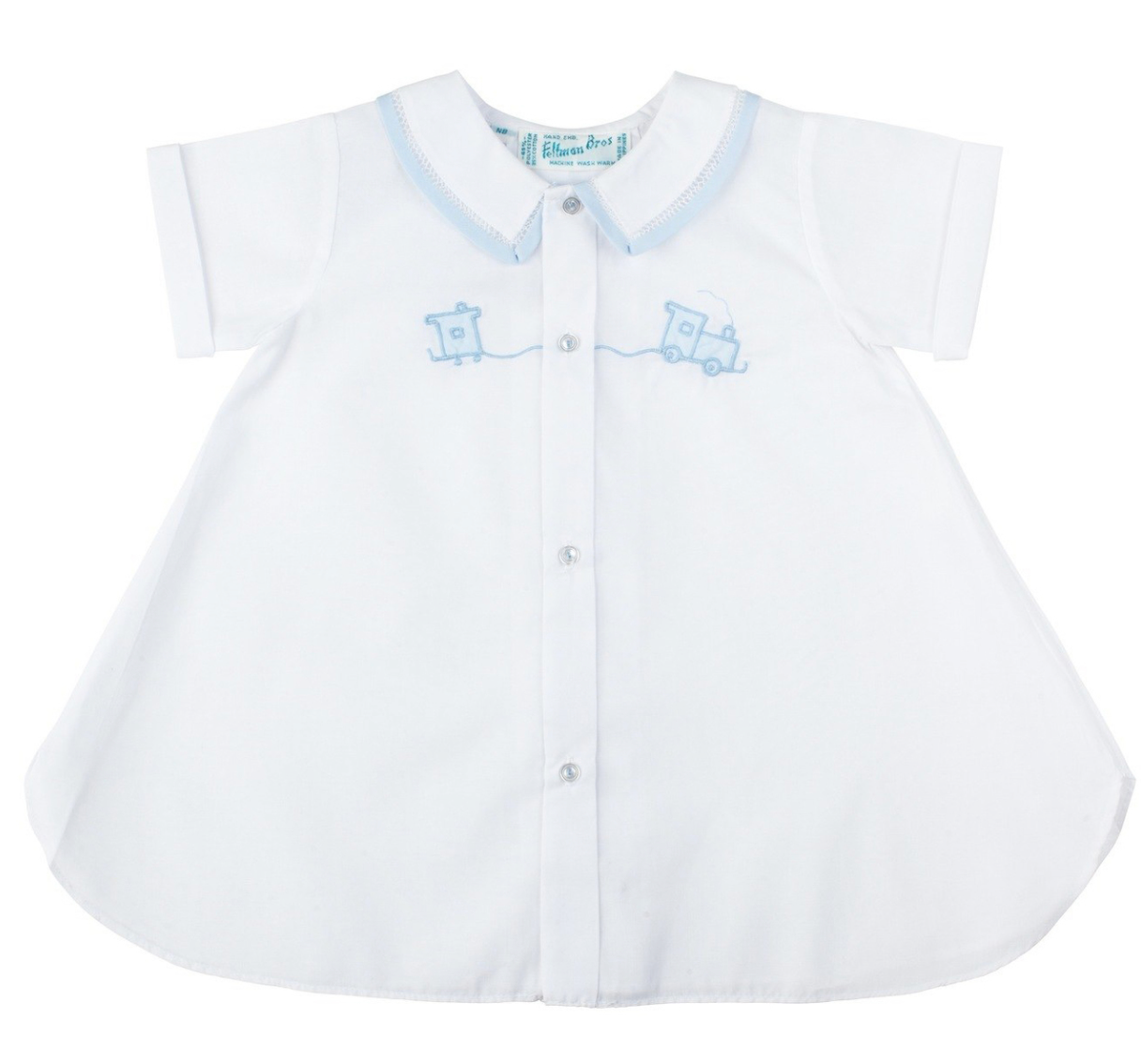 This classy day gown is just right for your baby boy! Available in baby blue and white colors, with contrasting piping along the collar attached with a thin line of fagoting. The bodice is embroidered with an adorable shadow stitch train applique going across the button down placket. This outfit is perfect for family portraits, warm days spend outdoors, and get-togethers with friends. Choo choo!