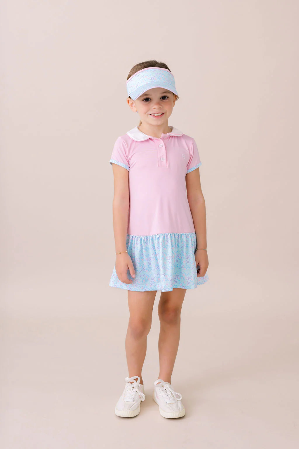 She will be ready to play her best game yet in our athleisure Darla Dropwaist Dress. Sporty, stylish, and oh-so-comfortable in Cotton Candy Pink athleisure with Frosted Floral athleisure skirt and welting.
