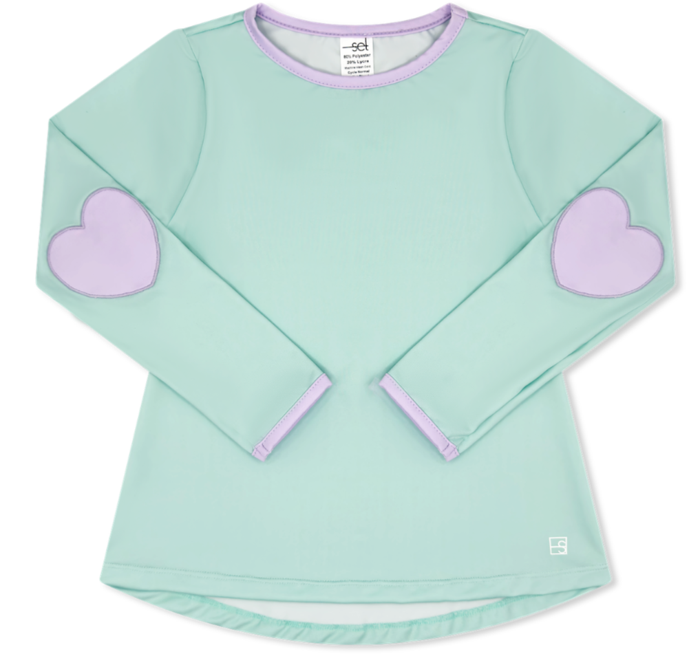 A basic but better, our Kylie Long Sleeve Tee is always accompanied by a fun elbow patch. This tee in Cool Mint with Petal Purple heart elbow patches goes perfectly with everything in our Be Mine collection.