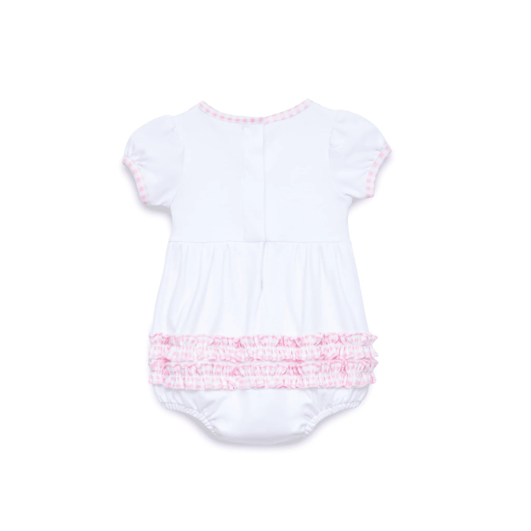 This adorable bubble is defined by its playful ruffles and whimsical style. The one-piece is made with Luxurious Pima Cotton and features a delightful hand-embroidered goose and ruffles accented with the signature pink checker trim.