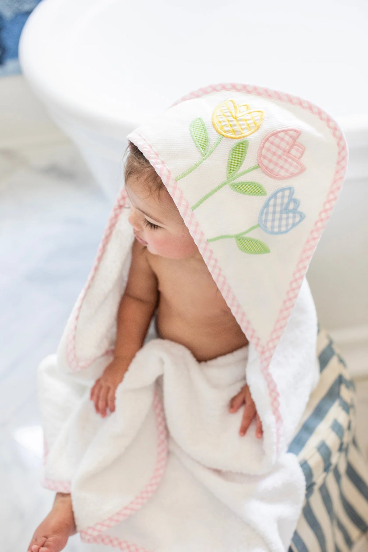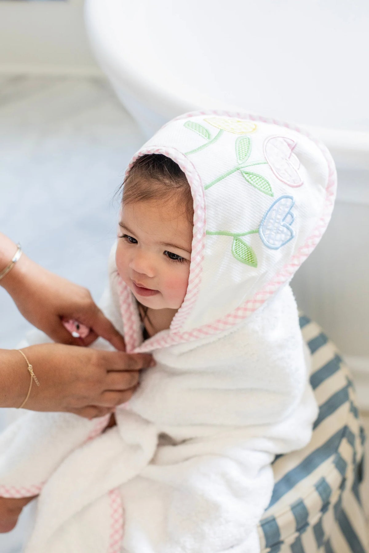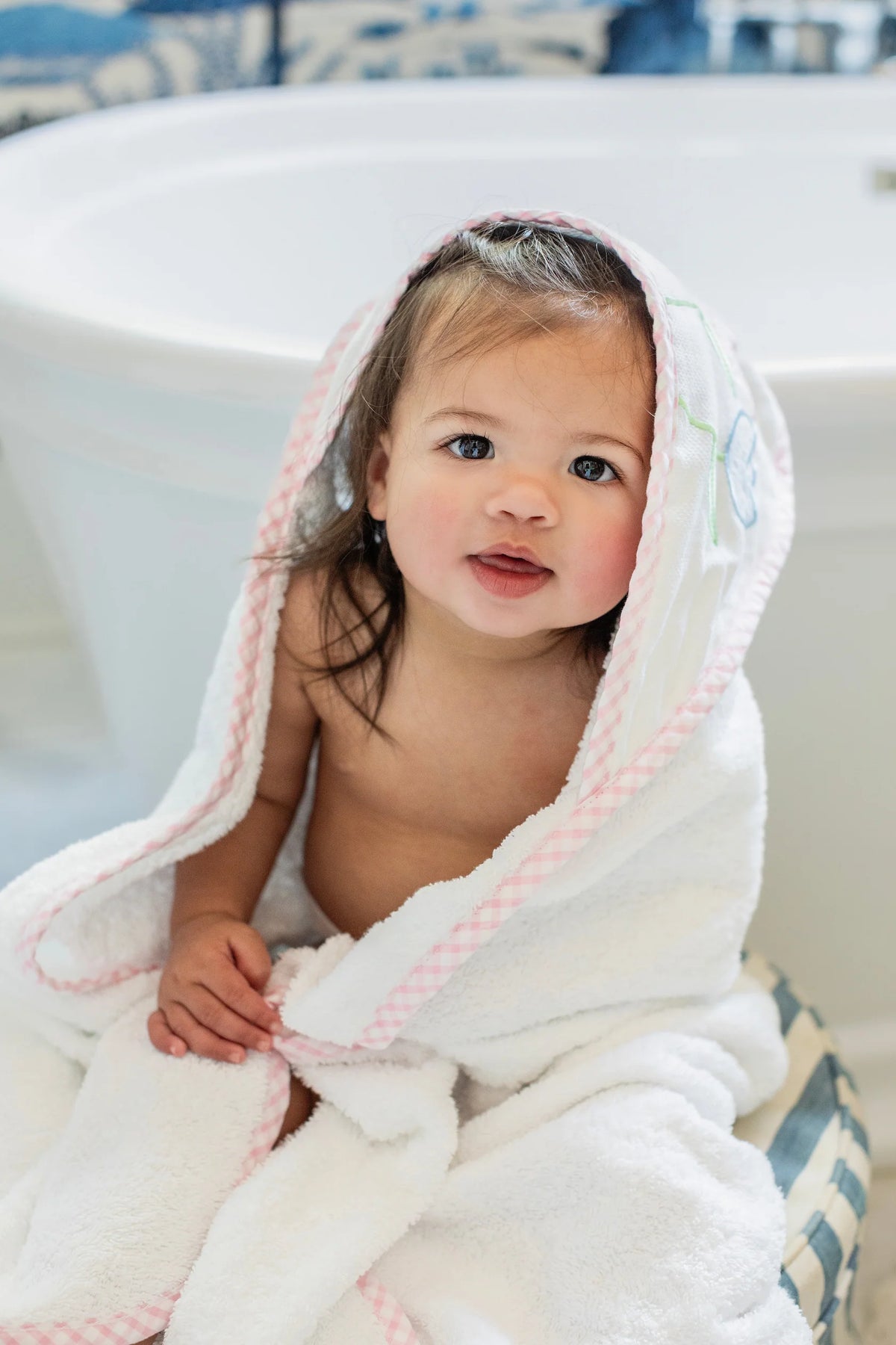 Made from ultra-soft, pure cotton terry, this towel is gentle on your baby’s sensitive skin—perfect for cozying up after a warm bath or a dip in the pool. It’s big enough to grow with your little one, lasting all the way through their toddler years! The cozy hood features a soft pique fabric that’s perfect for adding a monogram (for that extra personal touch) and backed with fluffy terry cloth for extra absorbency. Plus, the matching washcloth is trimmed with coordinating fabric to complete the cutest bath time set ever!