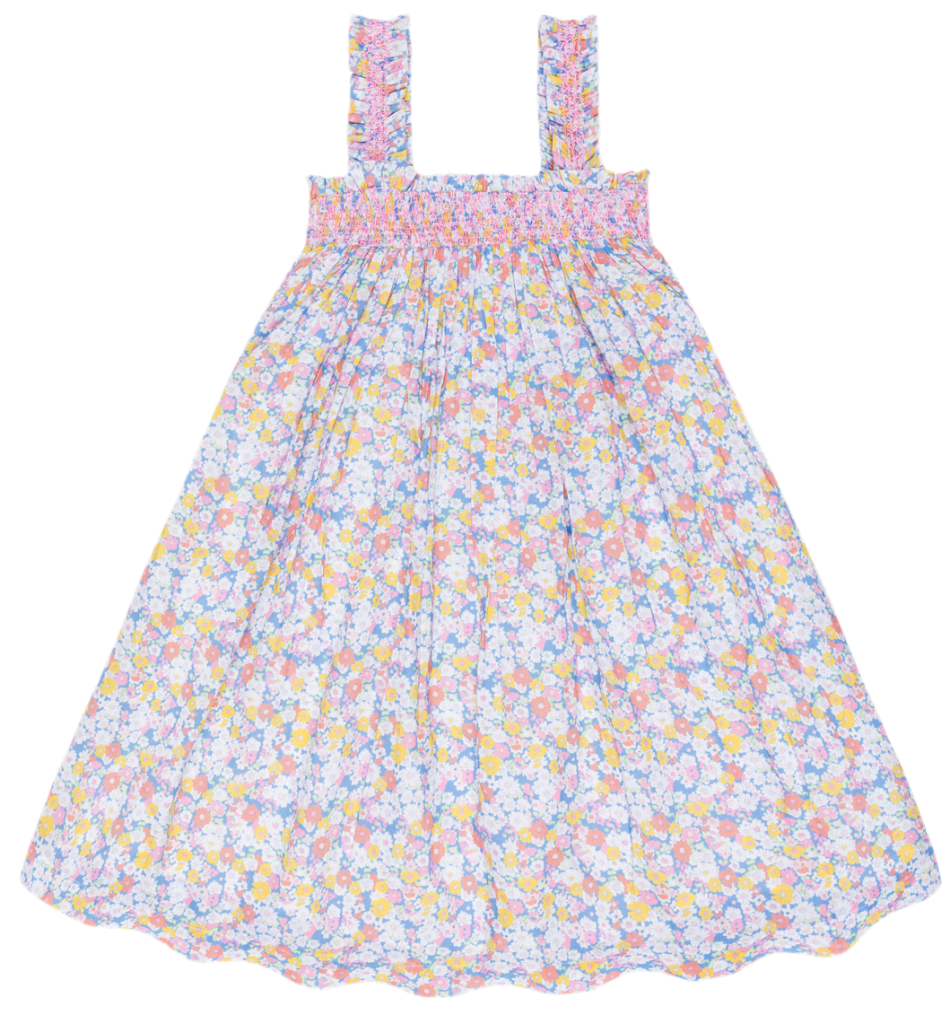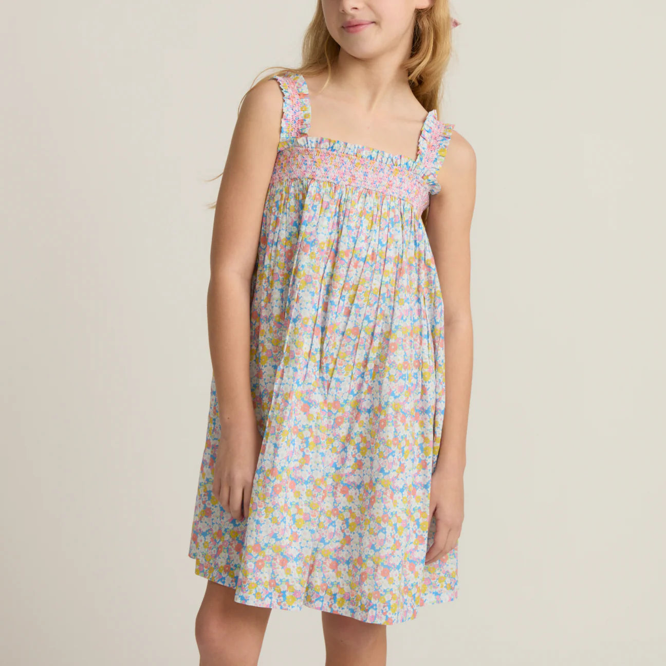 a new take on a smocked silhouette, this new dress is designed with a square neck and delicate smocking with sweet flutter sleeves. this dress is everyday ease at its best.