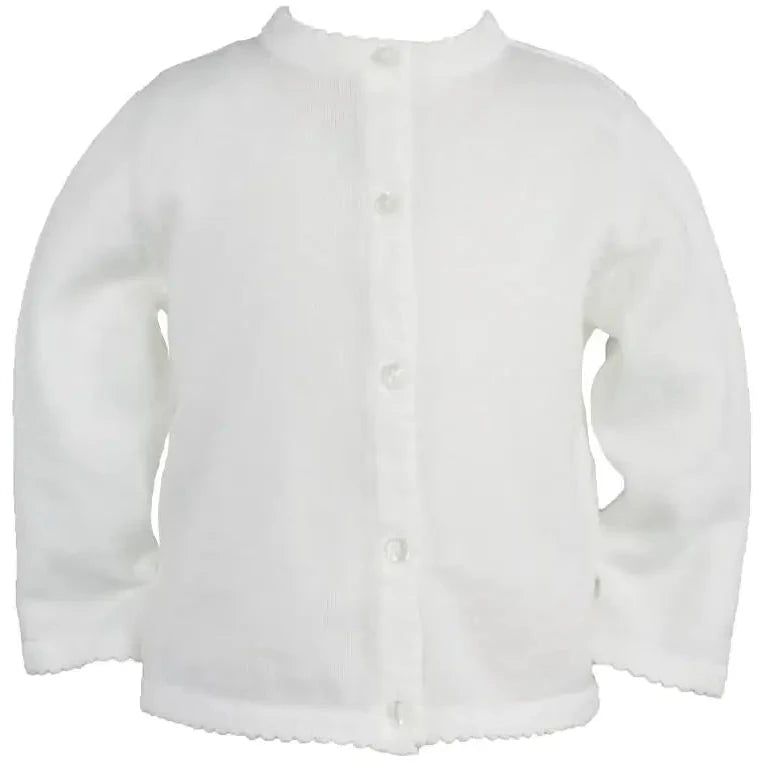 Our traditional and classic scalloped edge cardigan for baby girls makes a beautiful accessory for family photos and special occasions.