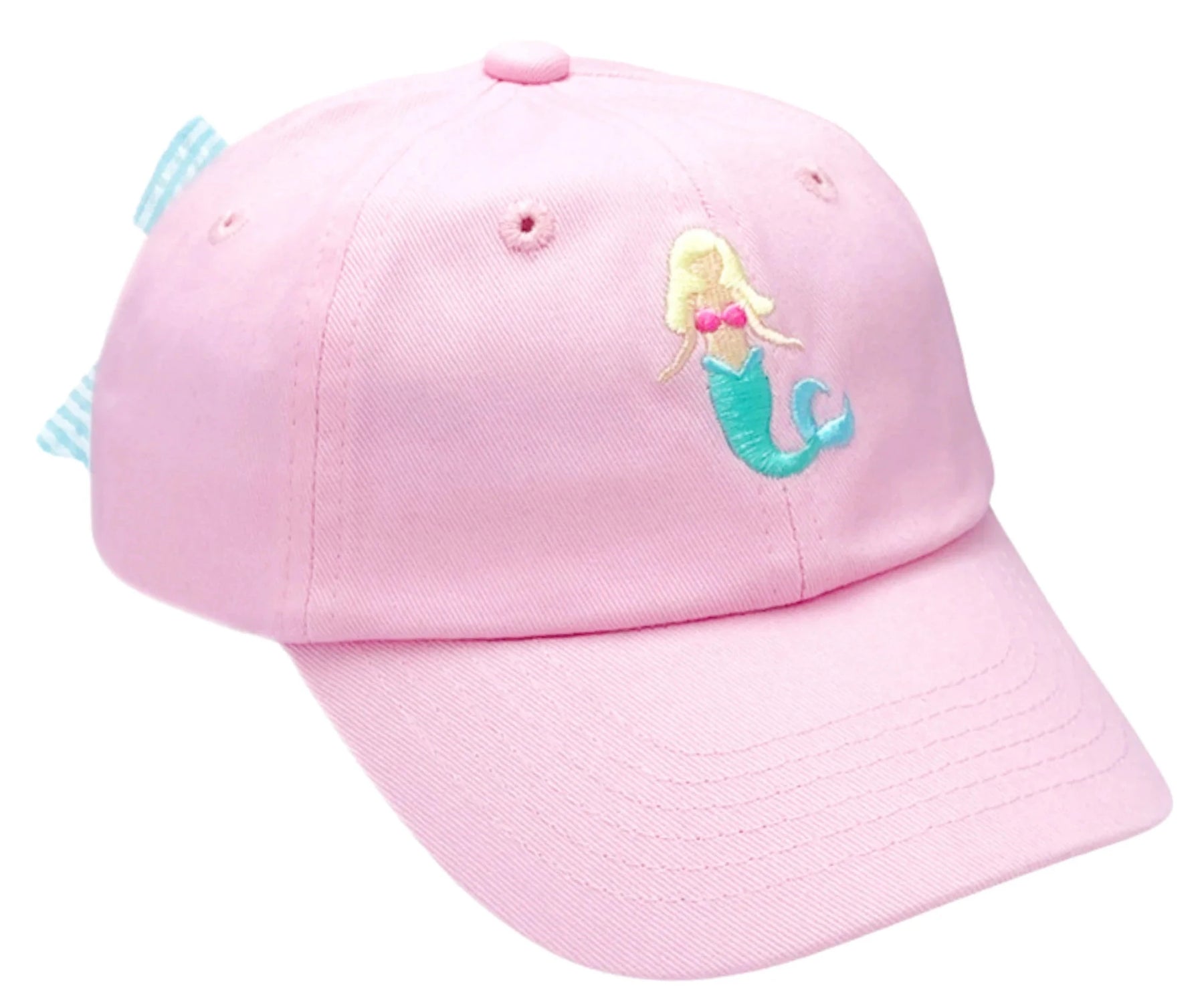 Flipping her fins will take her farther than ever when she completes her warm-weather wardrobe with our whimsically-inspired summer sportswear staple. From the seashore to the pool deck to everywhere under the sun and sea, our Mermaid Bow Baseball Hat is always an optimal accessory. Each soft cotton twill Palmer Pink hat is embroidered with a blonde turquoise-tailed mermaid that is perfectly complemented by an aqua seersucker bow in back.