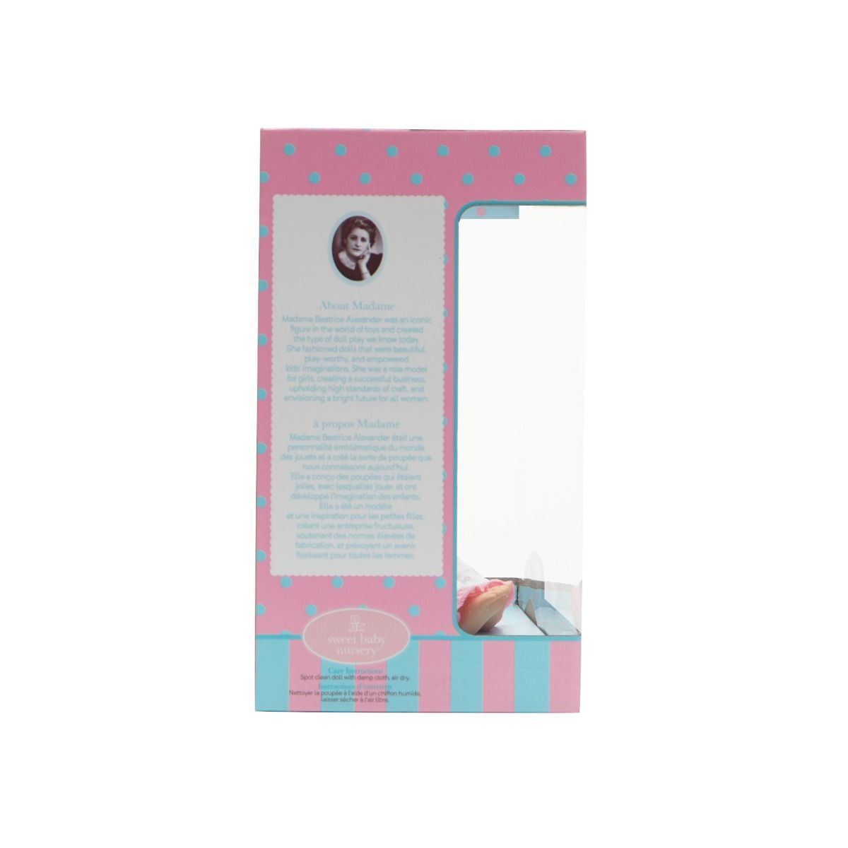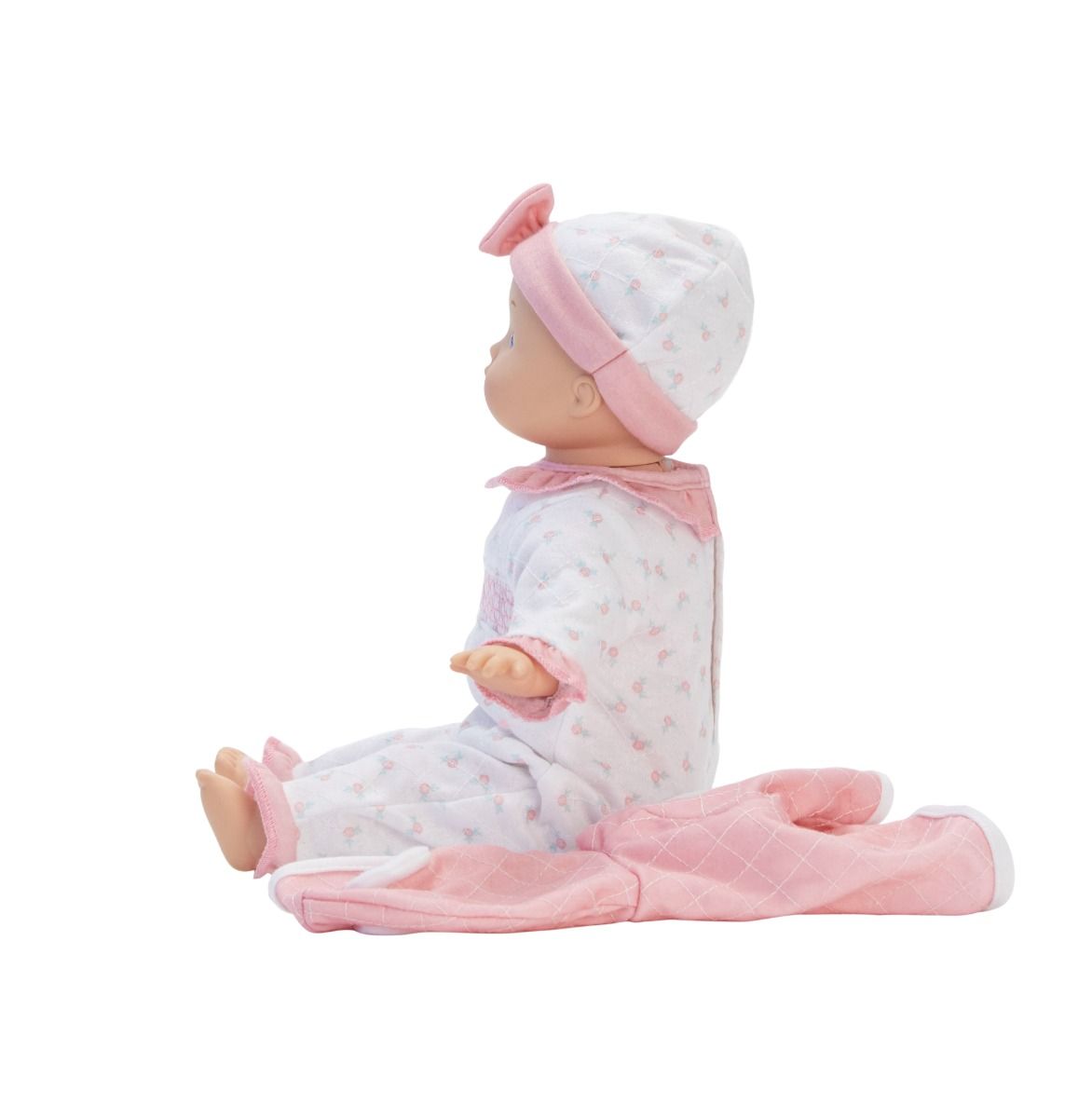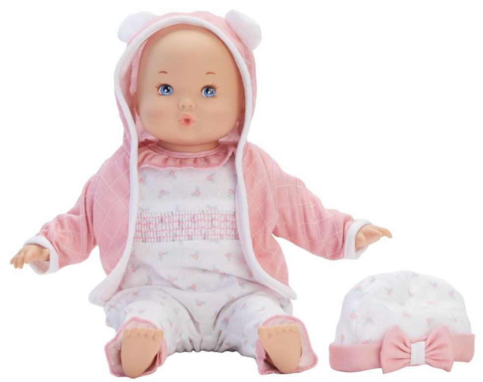 The 12" Sweet Baby Nursery - Bows & Bears is a light skin tone doll with blue eyes and a painted features and a soft, cuddly fabric body perfect for years of play! She wears a sweet floral sleeper with ruffles and smocking, and a soft hooded jacket with teddy bear ears! Accessories include a matching hat with a bow. All crafted with baby-safe materials!