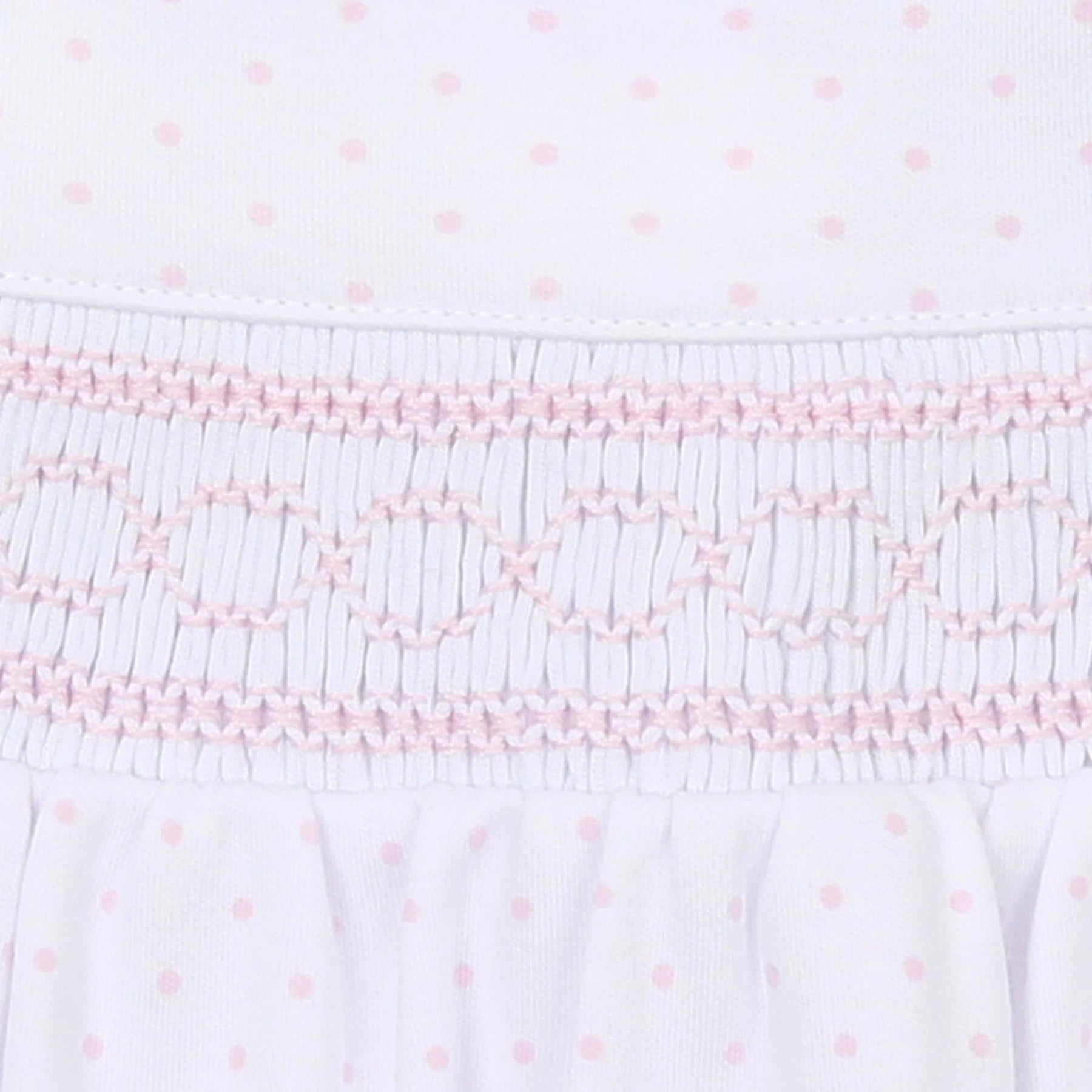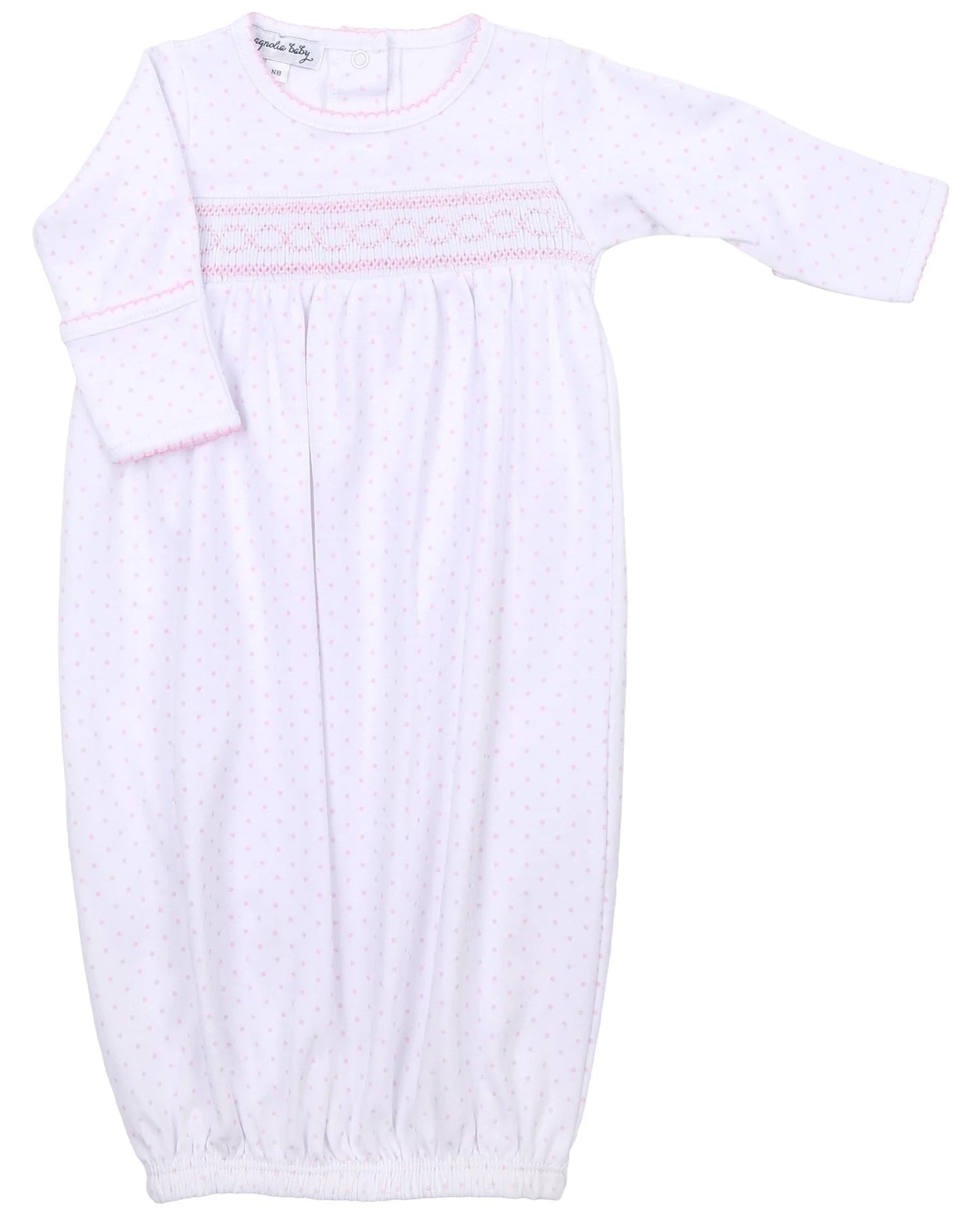 Treat your precious infant to the tender luxurious Pima Cotton of our Mini Dots Smocked Gathered Gown in a sweet rose tint. Presenting a delicate pink mini dot motif and exquisite hand-smocking detail on the bodice, this cozy gown is perfect for sweet dreams.