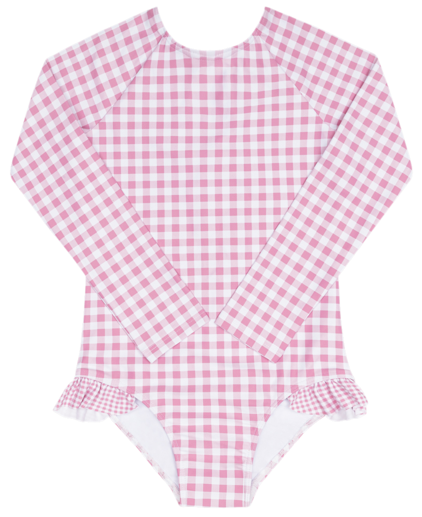 our signature sun-safe rashguard for girls made with our buttery-soft upf 50+ fabric. the chic grosgrain ribbon back tie is fixed with a hidden button closure for easy changes. the feminine ruffle hip detail makes this comfortable staple oh-so sweet.