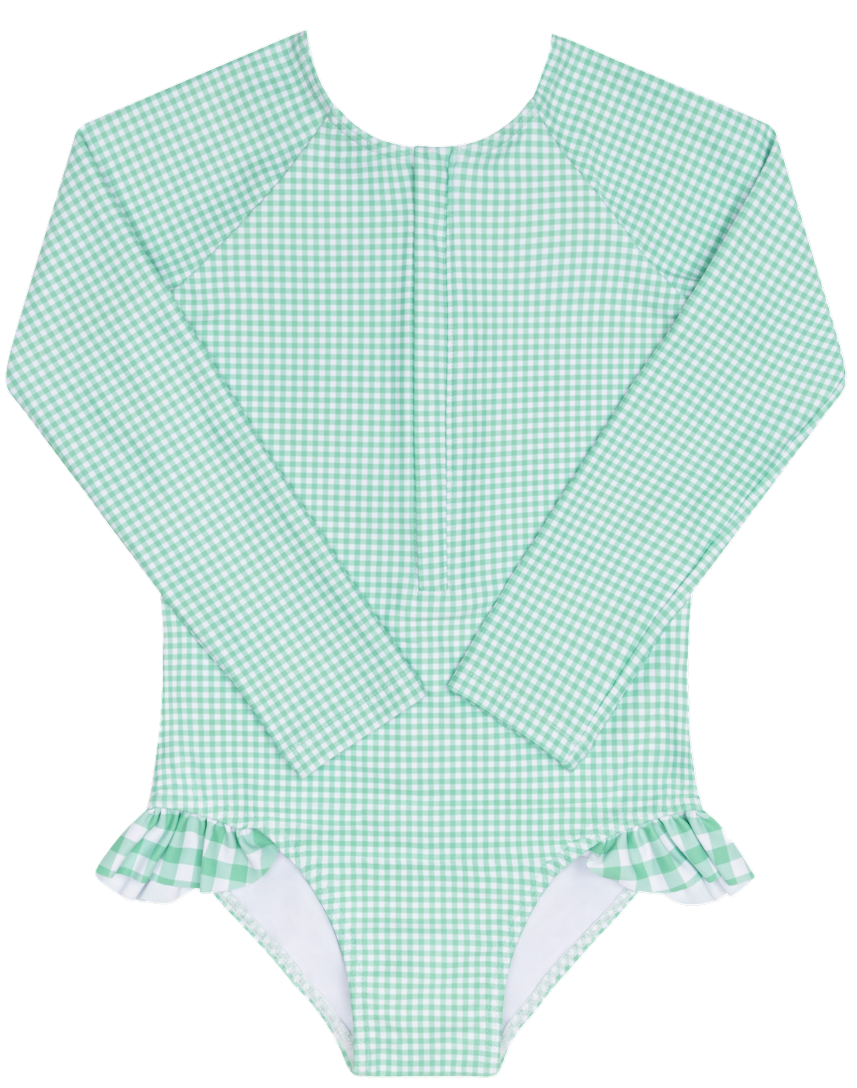 our signature sun-safe rashguard for girls made with our buttery-soft upf 50+ fabric and updated with a new front-zipper for easy changes. the feminine ruffle hip detail makes this comfortable staple oh-so sweet.