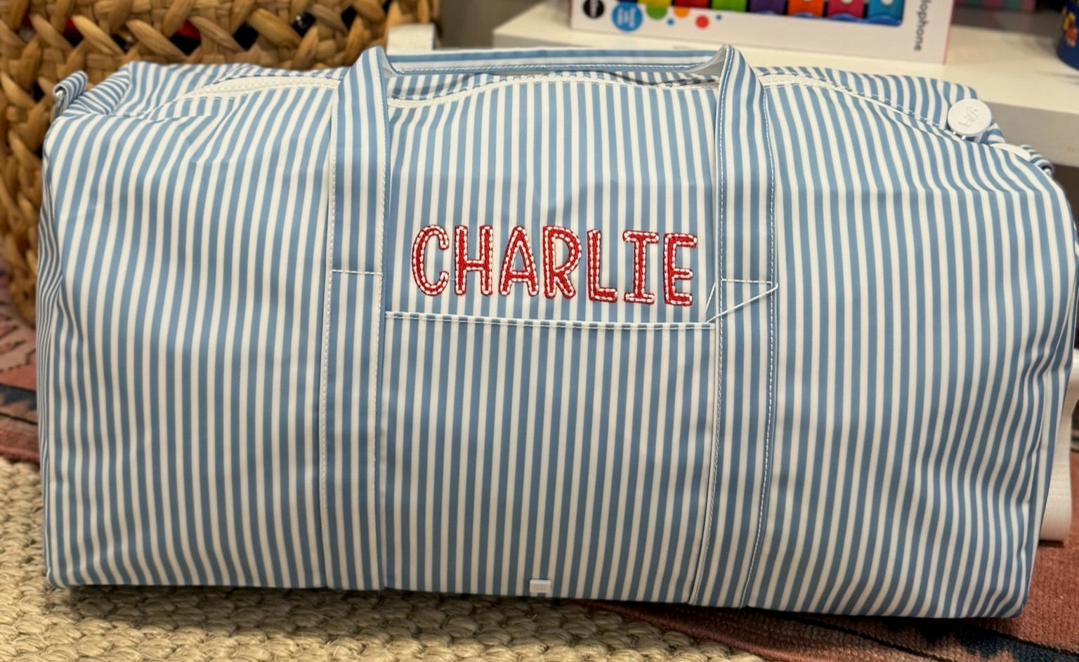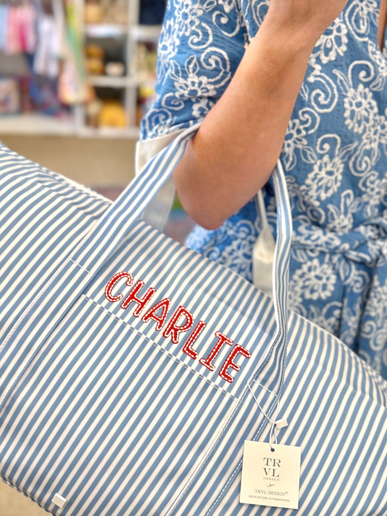Chambray Pimlico Stripe XL Weekender with "Charlie" Embroidery