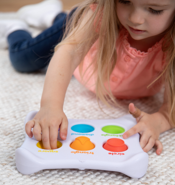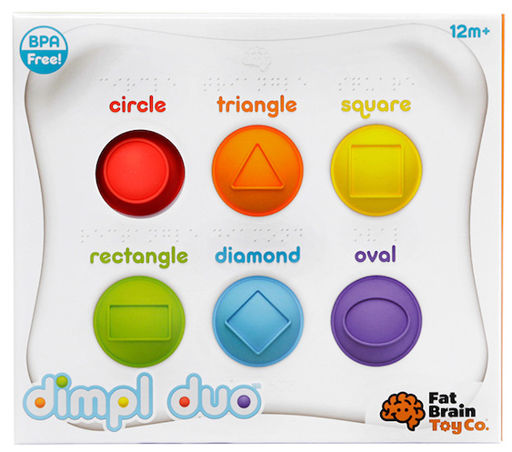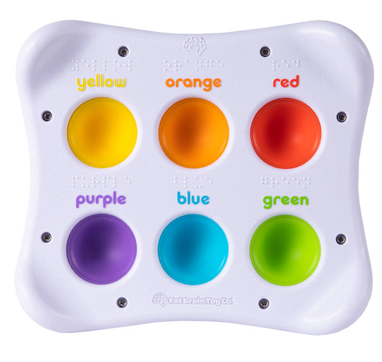 On one side, each silicone button is embossed with a different shape and labeled with its matching word in English and in Braille. Flip the whole thing over and this time, the buttons are smooth and the words match the colors!