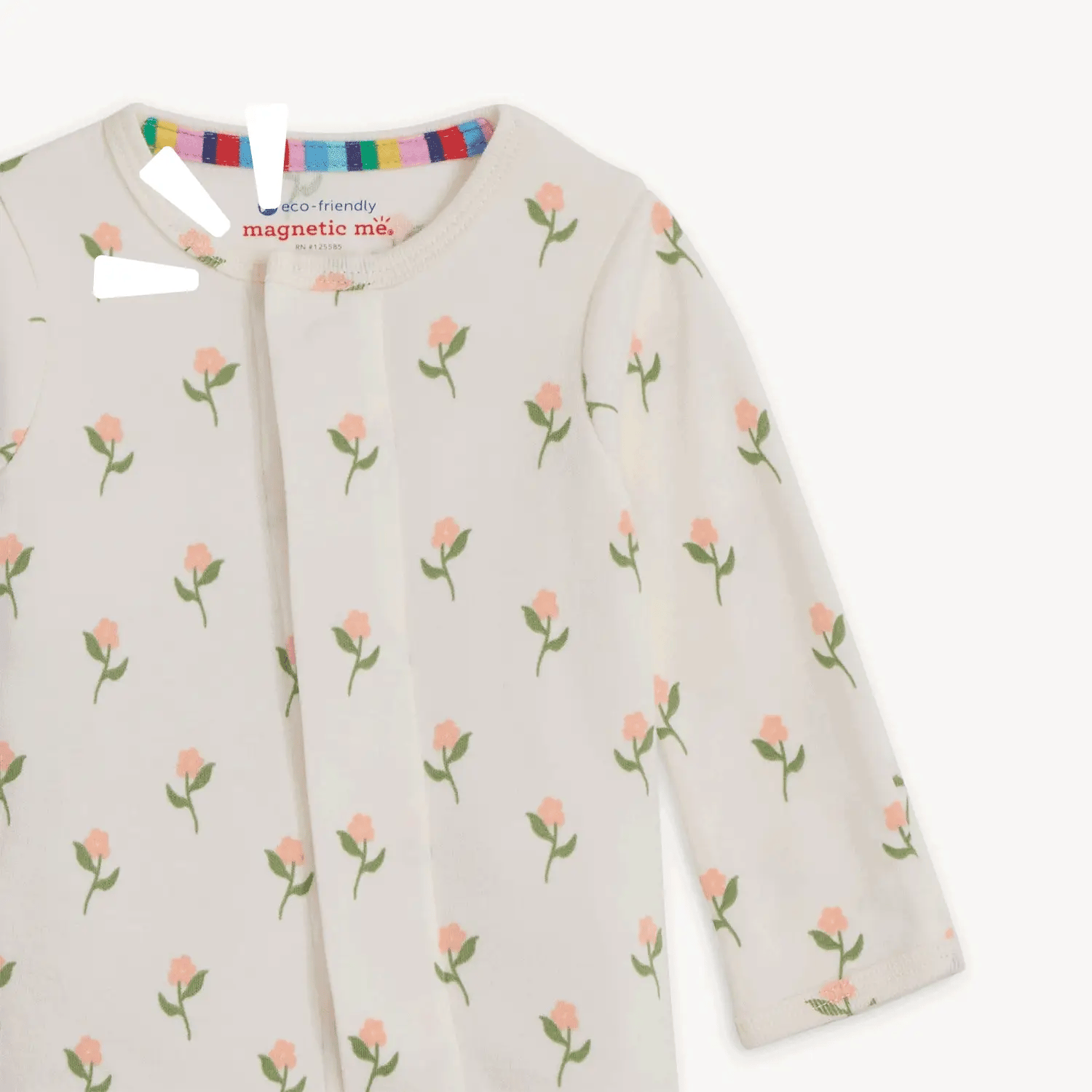 • Magnetic closures: magnets line the seam from the neck to upper thigh for sizes up to 0-3m & from neck to crotch for sizes 3-6m and up.