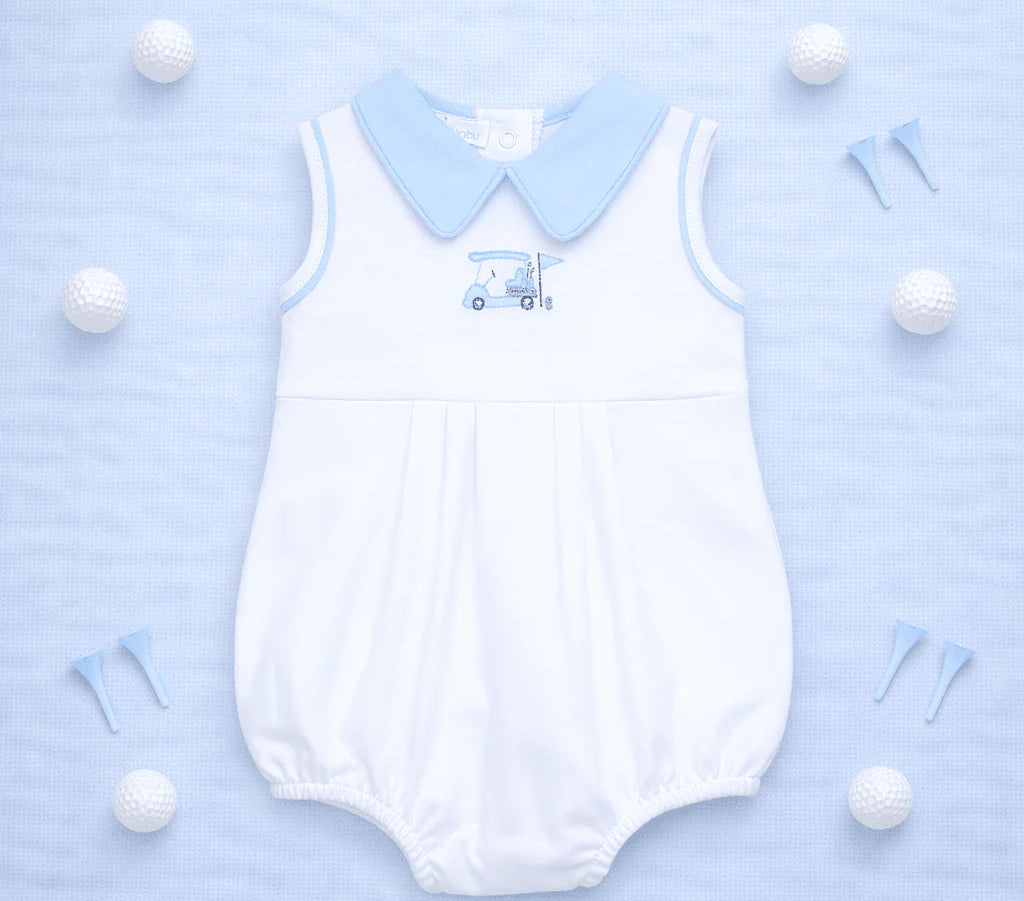 Get your little gentleman ready for the green in this timeless silhouette. This Pima Cotton bubble features a classic collar and light blue trim, capturing the essence of golf in a tender and meticulous way for your little one. Crafted with the signature Southern charm of Magnolia Baby, it offers a polished look that doesn't compromise on the soft, breathable comfort your baby needs for a day at the club.