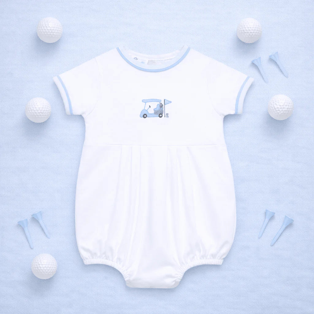 Celebrate refined style with this premium Pima Cotton bubble. With delicate light blue trim and signature hand-embroidery, this soft piece ensures your little gentleman looks elegant during his first spring outings at the country club. The classic bubble silhouette provides a timeless, airy fit that allows for plenty of movement while keeping him perfectly polished for family photos or clubhouse lunches.