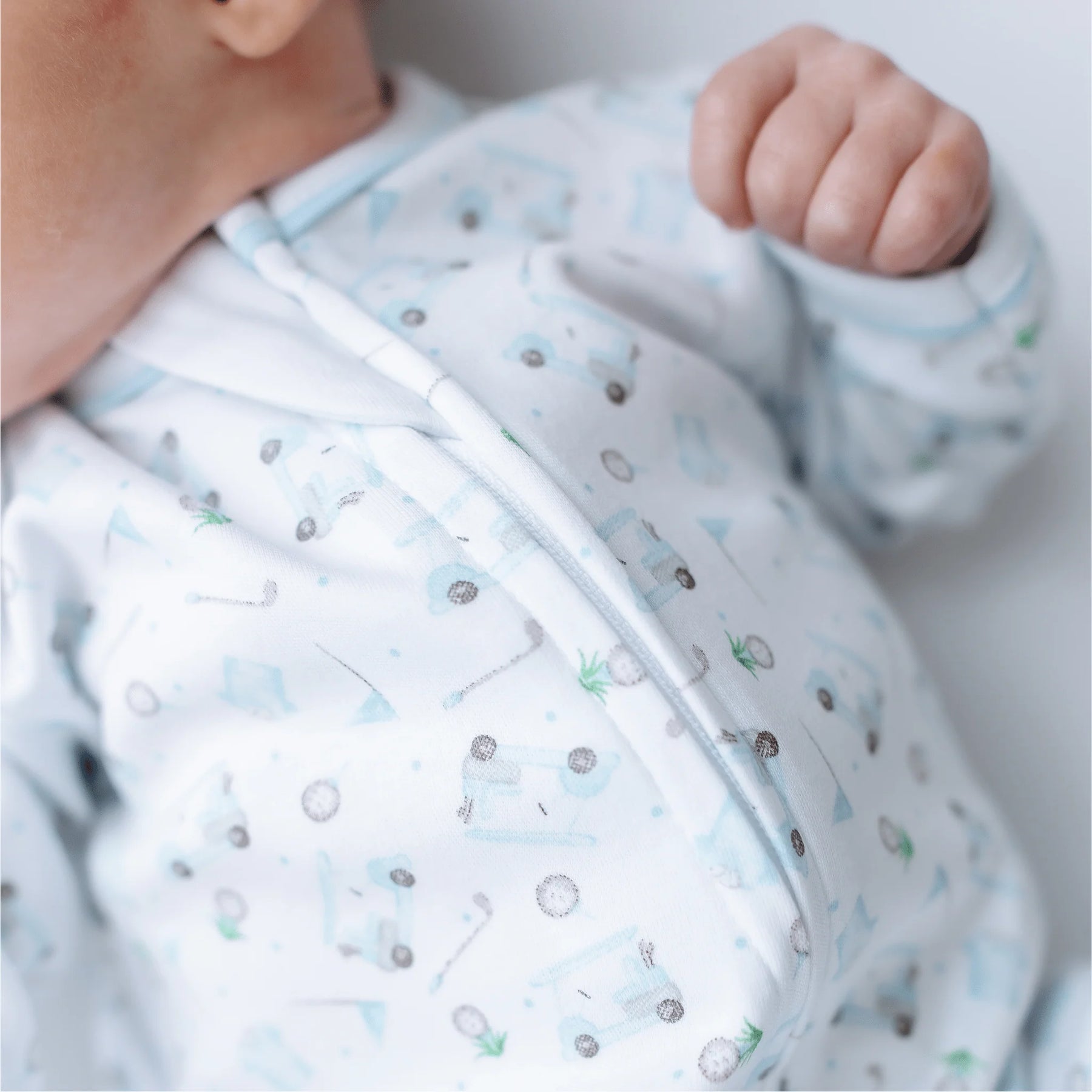 Combining the classic golf theme with modern convenience, this zip footie is a nursery must-have. Crafted from premium Pima Cotton with refined light blue trim, it ensures your little athlete stays cozy and stylish throughout his busy day. The whimsical all-over print featuring vintage-inspired golf carts and clubs brings a playful spirit to the traditional clubhouse look, while the ultra-soft fabric provides the ultimate in day-to-night comfort.