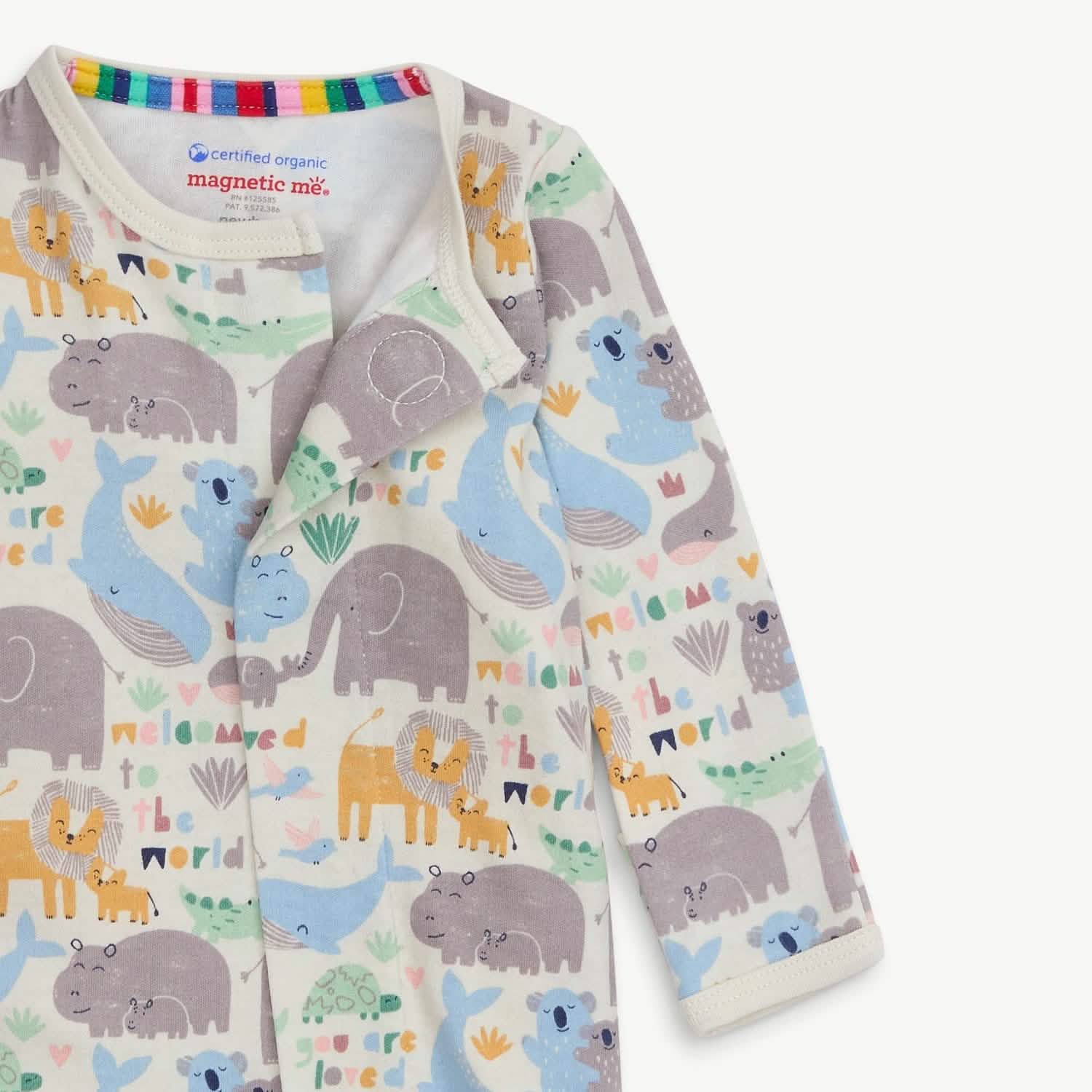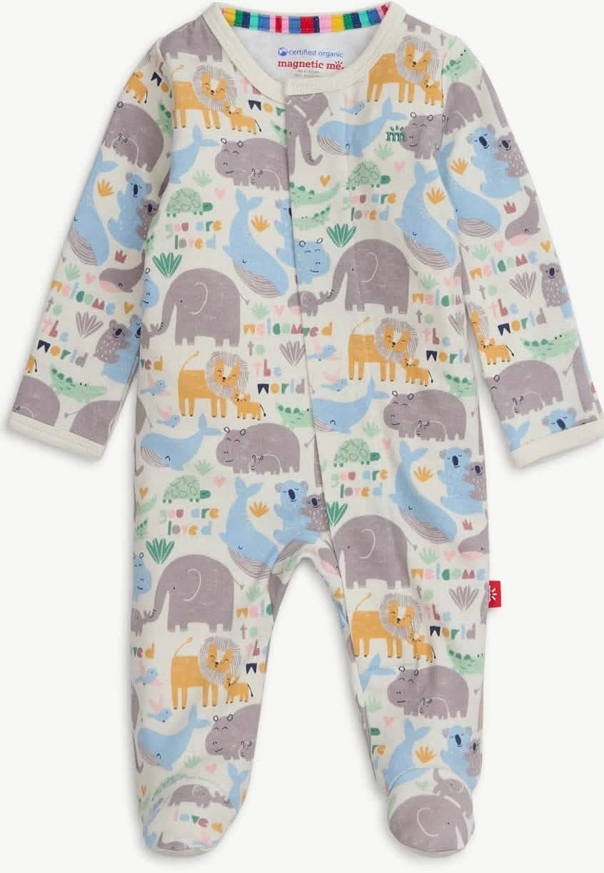 • Magnetic closures: magnets line the seam from the neck to upper thigh for sizes up to 0-3m & from neck to crotch for sizes 3-6m and up.