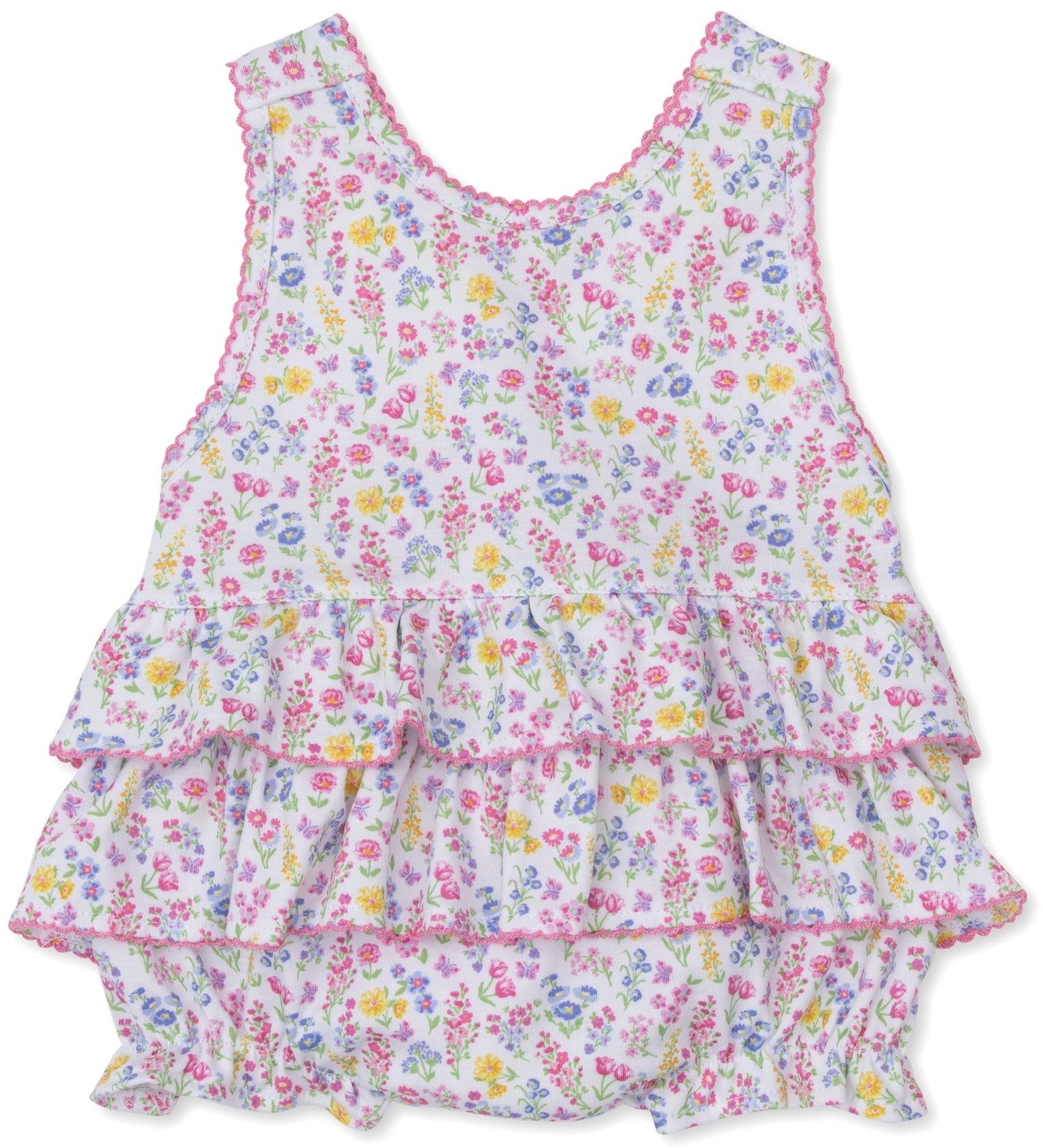 Perfect for warm weather, our darling bubble features our beautiful pastel gardens floral print, ruffles, and is made from the softest Pima cotton for ultimate comfort.