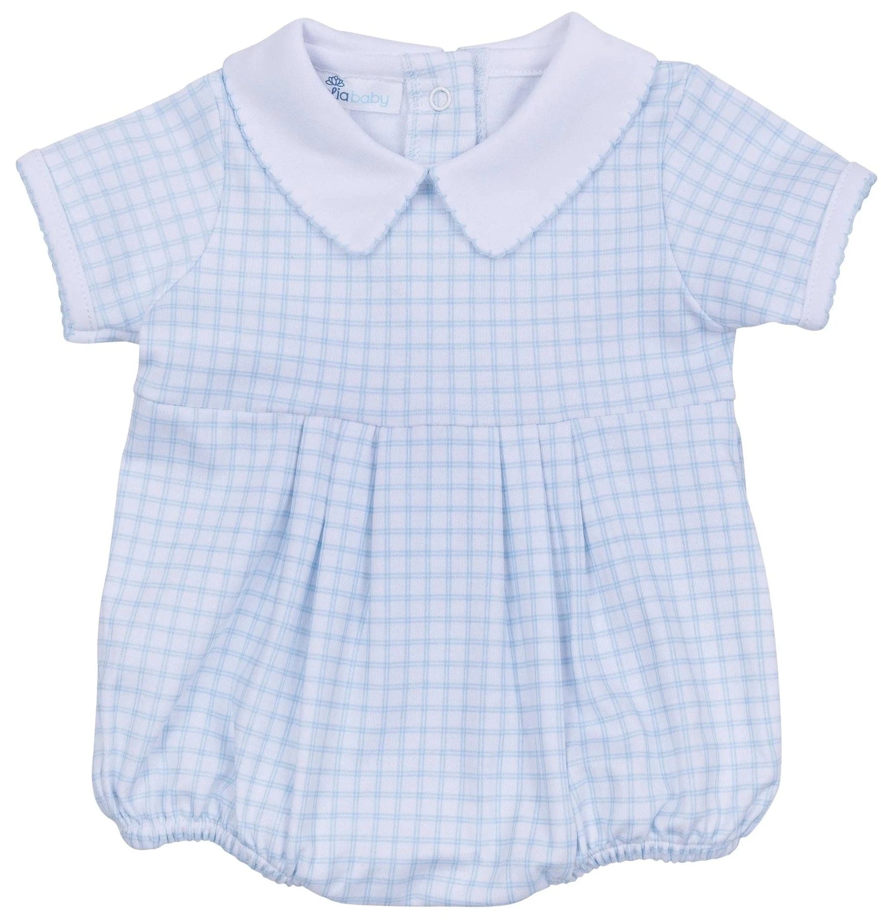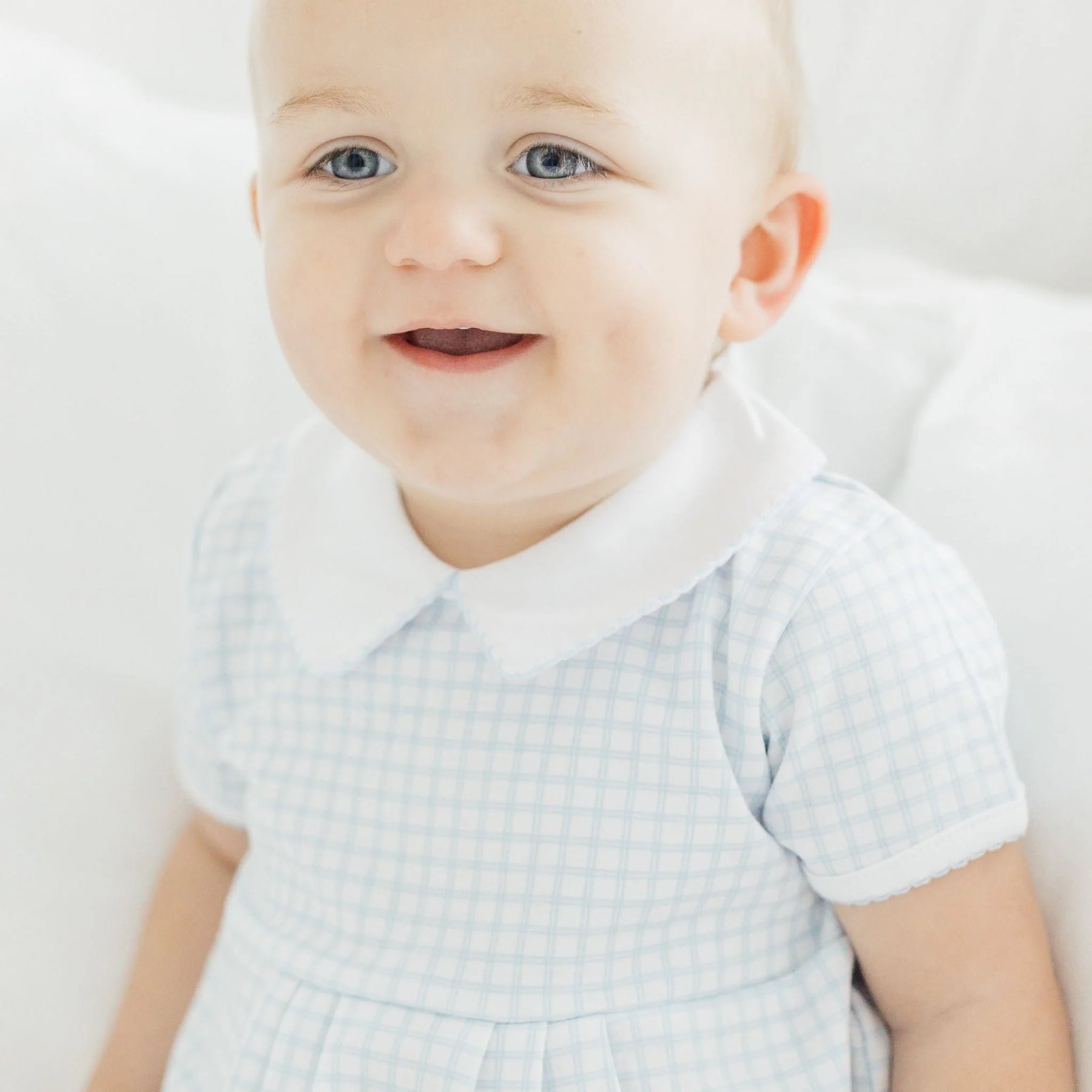 Create joyful moments with our Peek-A-Boo Wishes Collared Bubble in light blue, crafted from the most luxurious Pima cotton. This adorable bubble features delicate pink picot trim and a charming check pattern, perfect for spending quality time with family, visiting loved ones.