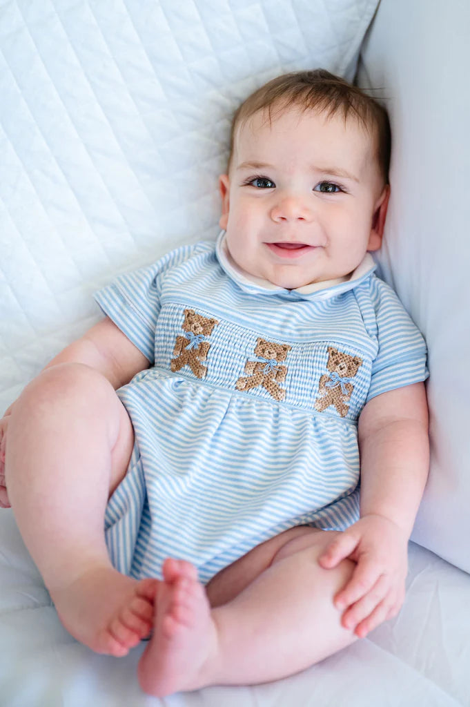 Adorable Teddy Bear smocking on soft light blue striped pima cotton fabric.. Its charming design adds a sweet touch to cuddle time.