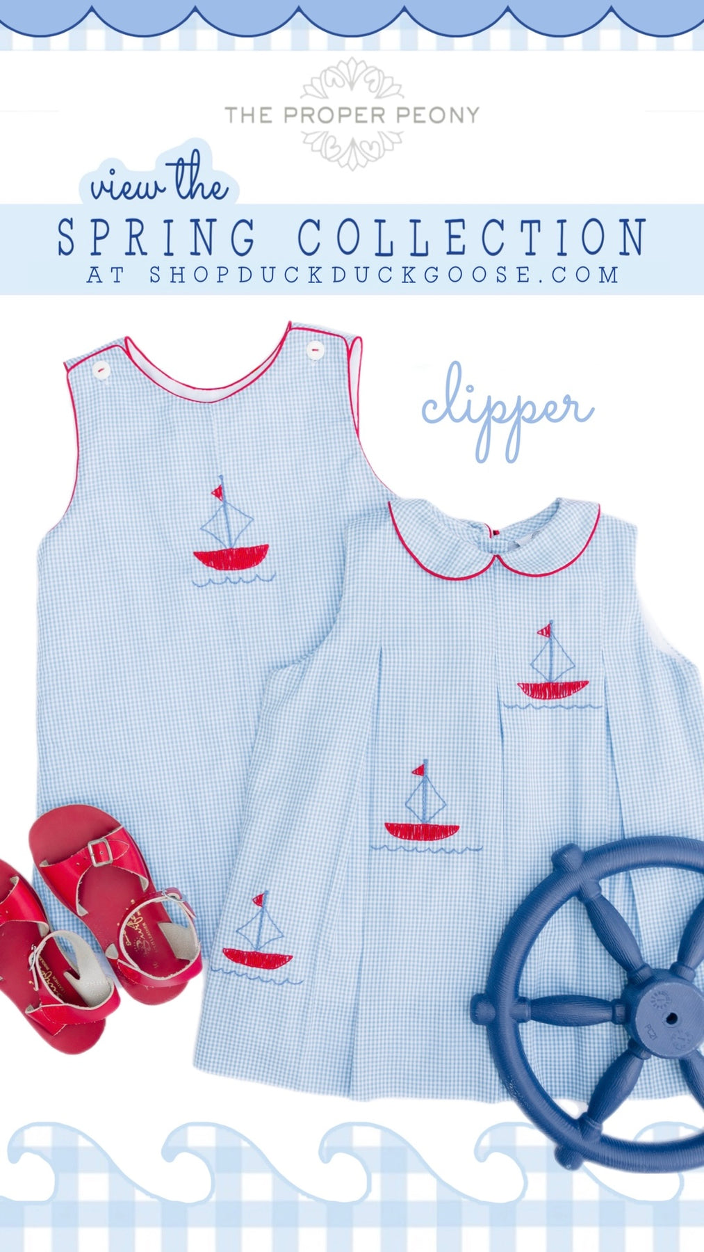 Sail away with the cutest Clipper Collection. The combination of blue and white gingham with touches of red create the perfect palette.