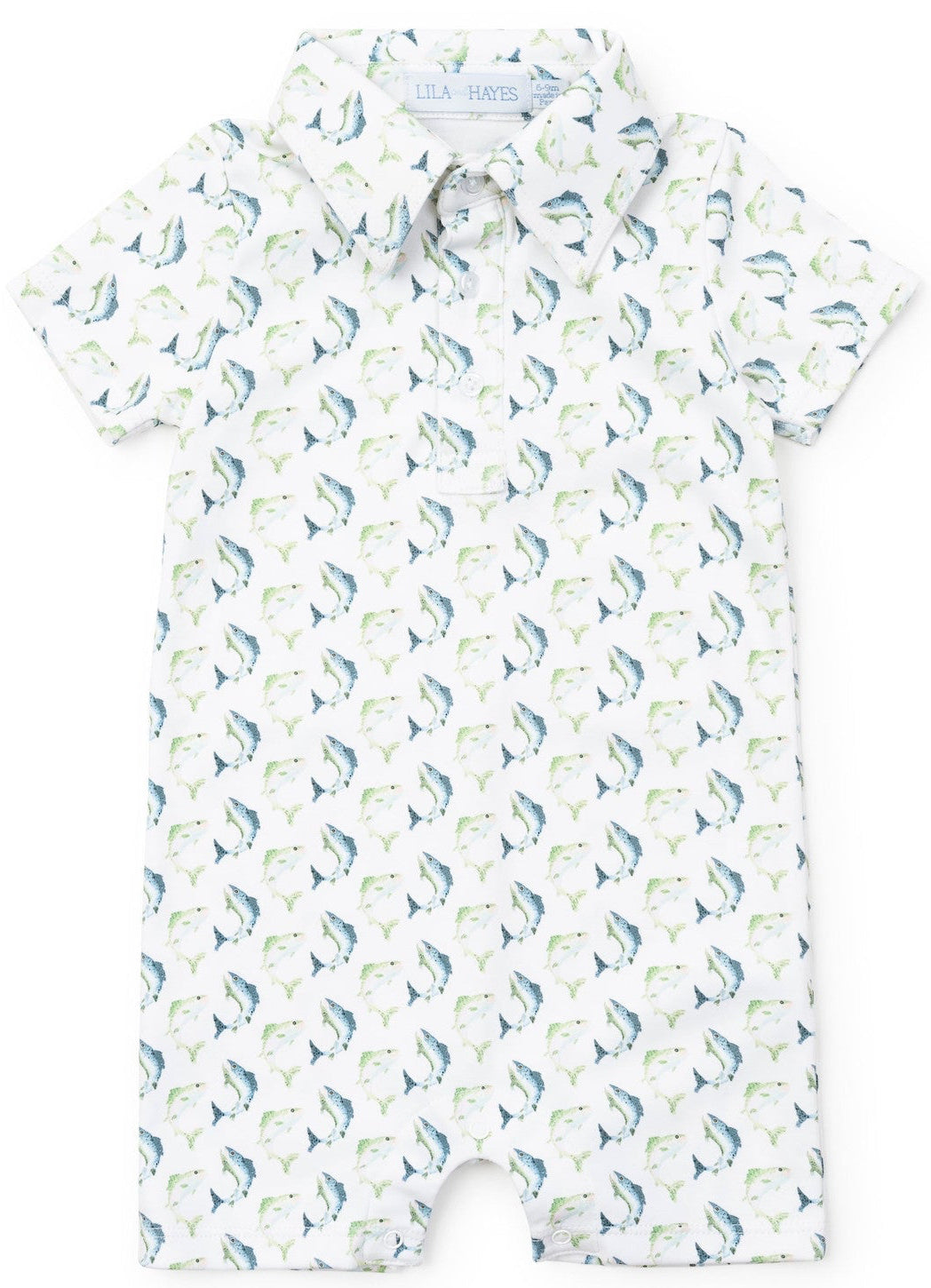 Short sleeve polo-style shortall with button front and three snap closure in stride. Coordinates perfectly with the Griffin golf shirt for the older boys.