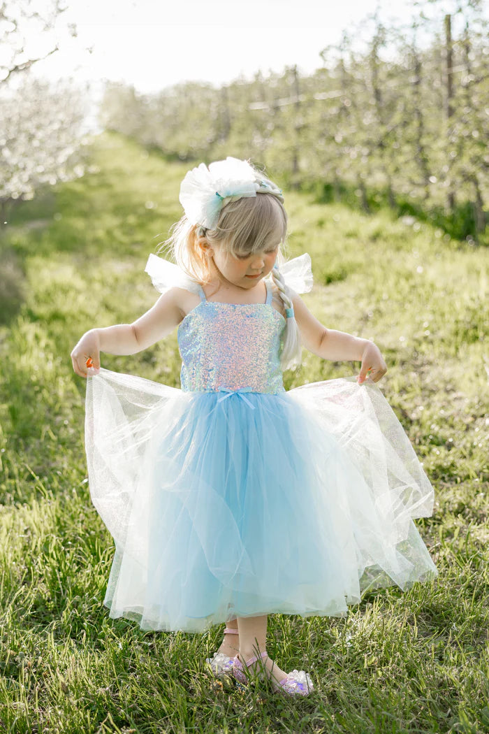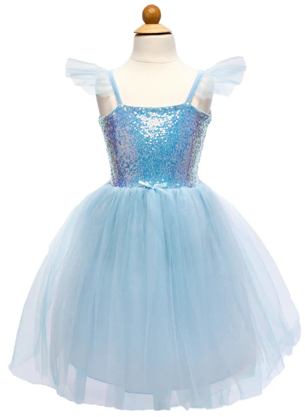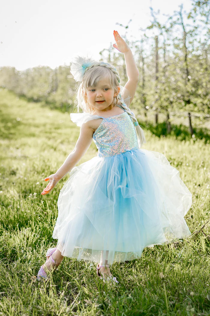 Be a perfect princess in this sparkle and shine blue dress. With 2 layers of soft blue tulle and a layer of iridescent glitter tulle, your skirt will always be fluffy and bright. The sequin top is made from iridescent sequins with a soft stretch spandex lining. The straps are made with stretch spandex and feature tulle puffs. A small satin bow detail finishes this adorable princess dress with a touch of class.