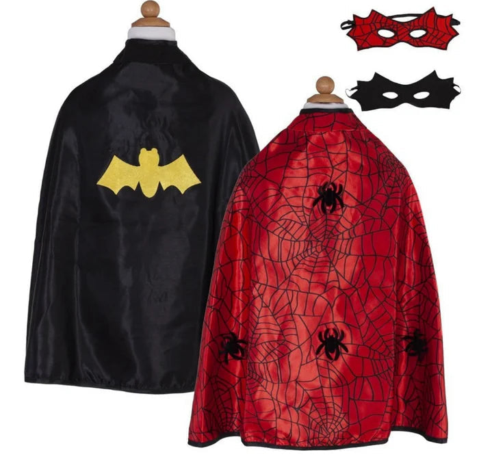 Our multi-award-winning design is perfect for little superheroes everywhere! This adorable reversible cape offers twice the fun with quality design and versatility. The black satin side feature a yellow bat emblem and reverses to a red spider web satin print on the reverse side with large black velour foam spider details. The Velcro closure at the neck makes switching superheroes a breeze.