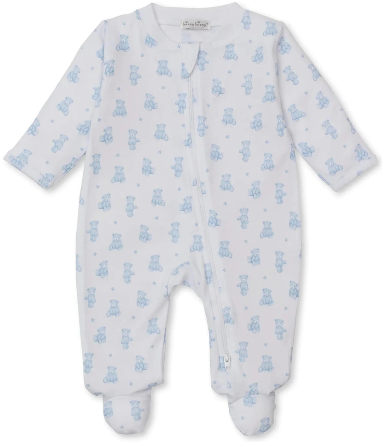 Playfully patterned with our teddy bear time print, our cozy, zippered footie for your precious baby is made from the softest Pima cotton for ultimate comfort.