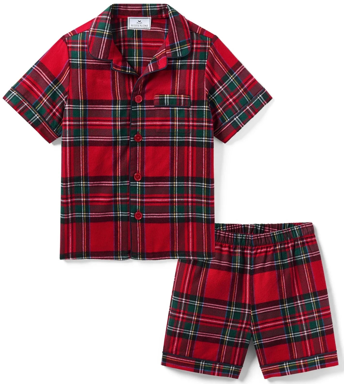This Classic Short Set is accented with, contrast piping and finished with buttons. The sleepwear is made from the finest quality cotton and blended with just enough inherently flame retardant fiber to allow it to pass strict CPSC flame retardant laws without using harmful chemicals. The fabric is brushed for added softness, making the sleepwear feel absolutely luxurious, getting cozier after each wash. Your little one will be tucked in love and off to dreamland. Bonne nuit.