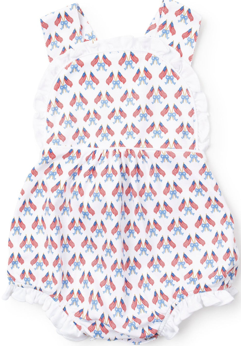 Girls' cross back sleeveless pima bubble with ruffles. Snaps secure the straps in back and three snaps in the stride. Gathered waist in the back. Coordinates with the Eden Dress.