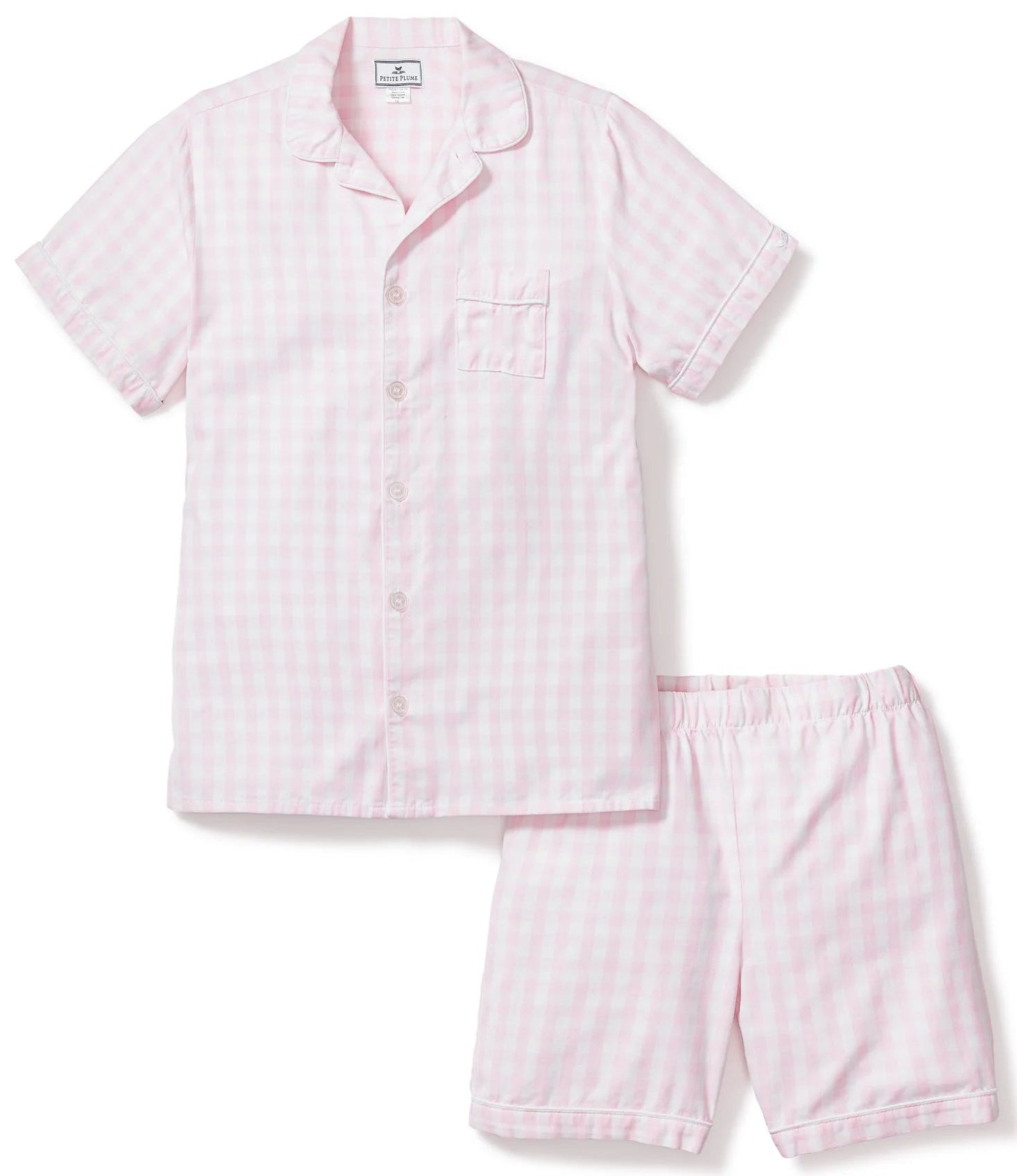 Gingham print dating back to the 17th century is a staple. This classic pajama set is accented with white piping and finished with pearl buttons.