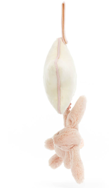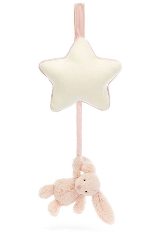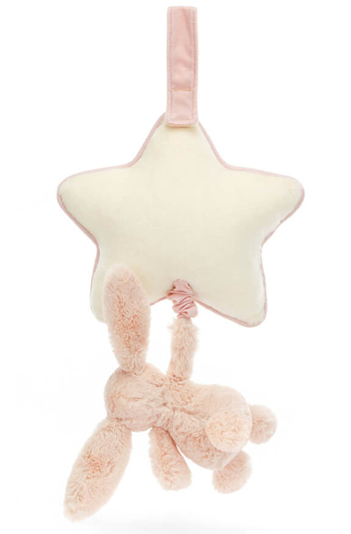 An enchanting newborn gift, let babies dream sweetly with a Bashful Blush Bunny Musical Pull. Our most loved Bashful Bunny, in soft, pale blush fur made from recycled fibres can be gently pulled to hear an original Jellycat lullaby. The cream star shaped musical pull with contrast trim can be attached to a crib or pram with a Velcro fastening.
