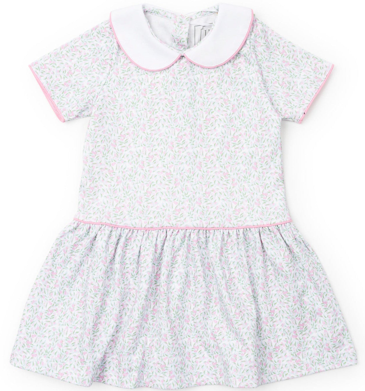 Short sleeve pima cotton dress with peter pan collar and contrast piping. Button closure up the back. Drop waist ruffled skirt.