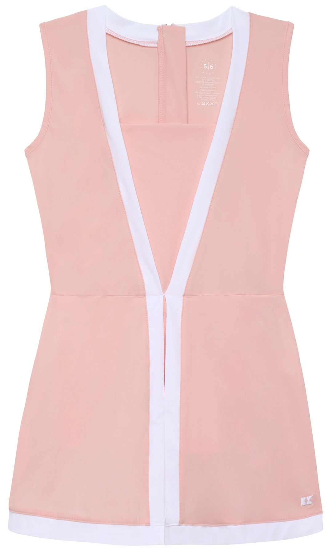 the pink rally dress is where sporty meets stylish. this standout pink dress features bold white contrast trim for a crisp, retro edge. the a line cut is flattering and the built in shorts give the active girl the freedom to move, stretch and shine on or off the court. a built in zipper makes it easy to get on and off.