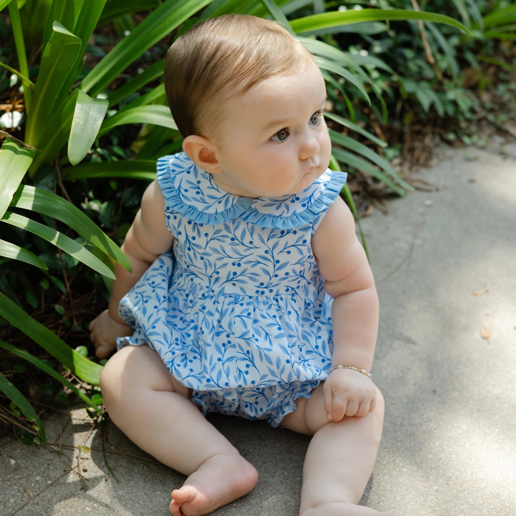 The Summer Breeze Floral Romper Short features hand-drawn blossoms scattered across soft cotton fabric. The bubble shape and light gathers create a sweet, timeless silhouette. A design that brings the season’s freshness to every sunny day.