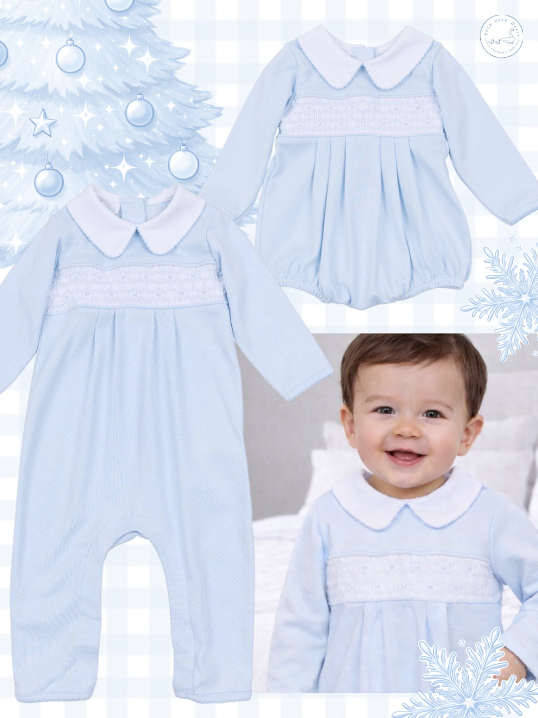 Hand-smocked front panel – intricate stitching with refined light blue embroidery