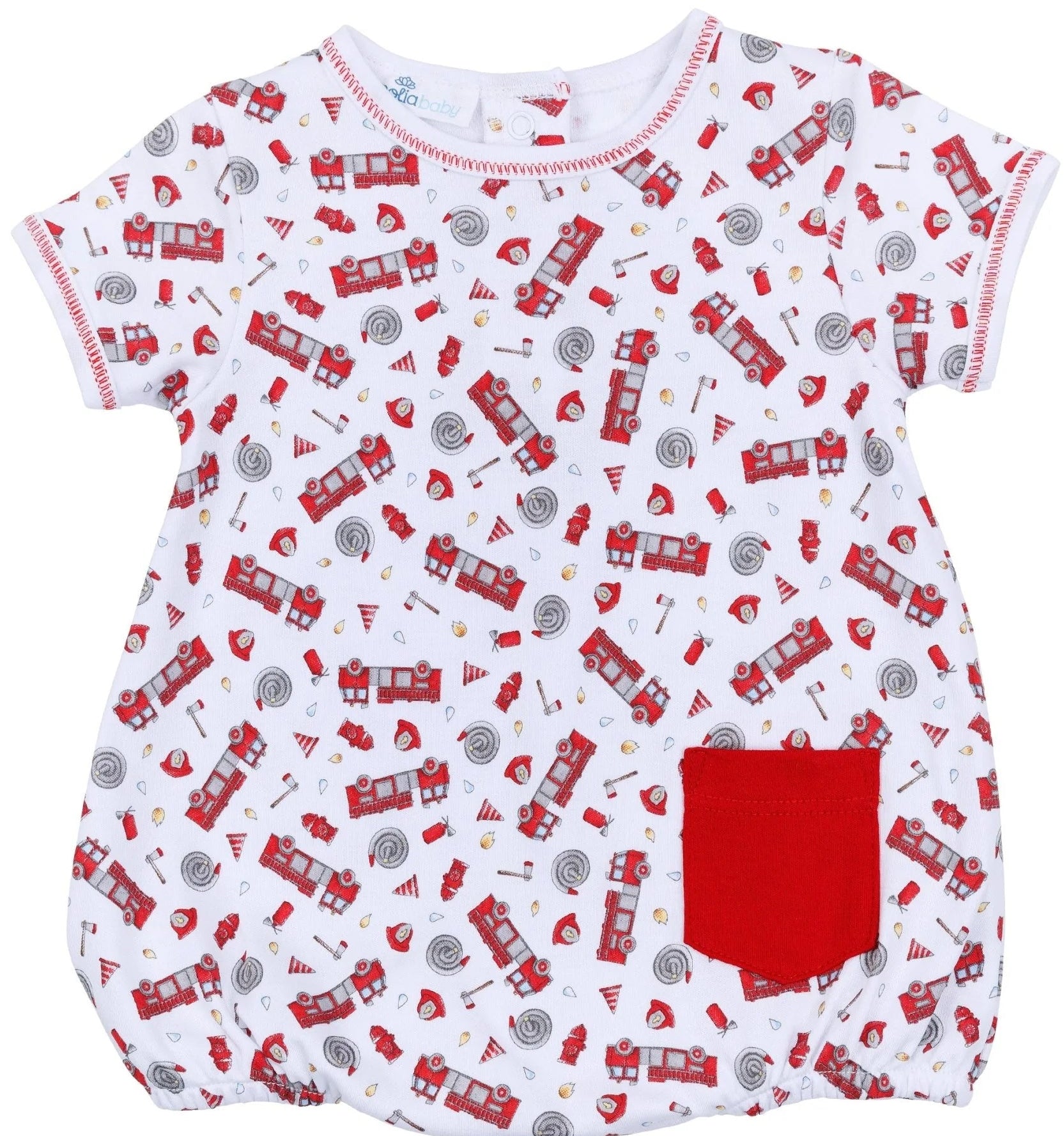 The **To the Rescue Print Bubble** is a playful yet sophisticated one-piece for celebrating his adventurous spirit. Crafted from luxurious Pima Cotton with the **all-over firefighter print**, this bubble is comfortable and features easy snap closures. It’s the perfect blend of dynamic style and high quality.