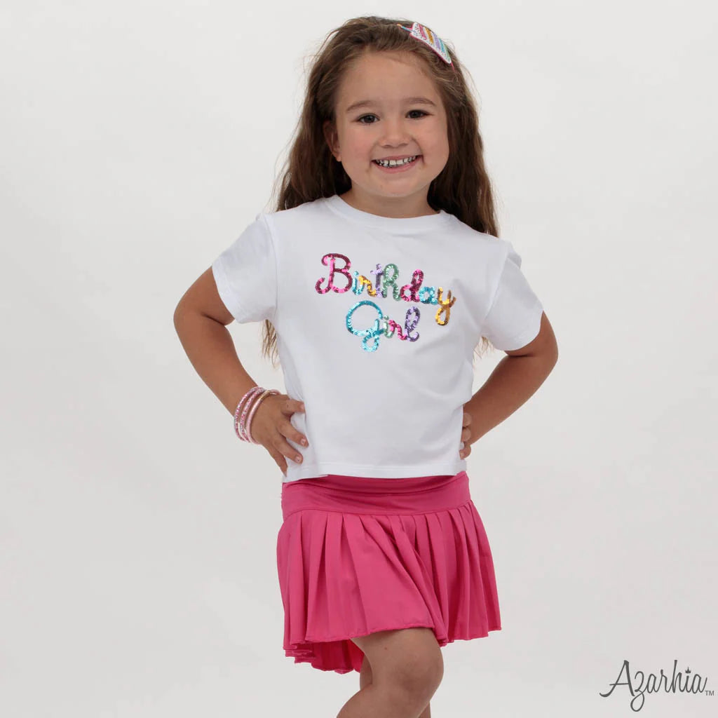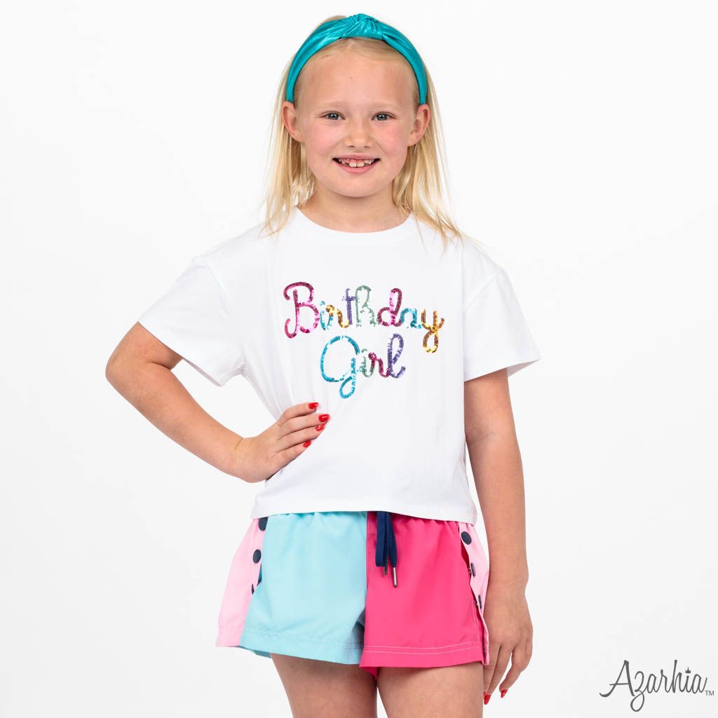 Celebrate the special day with our Birthday Girl sequin Boxy shirt! Featuring playful wordplay with sequin embellishments on a white boxy cut, this shirt is sure to add a touch of fun to any birthday outfit. Perfect for the birthday girl who loves a bit of sparkle and humor!