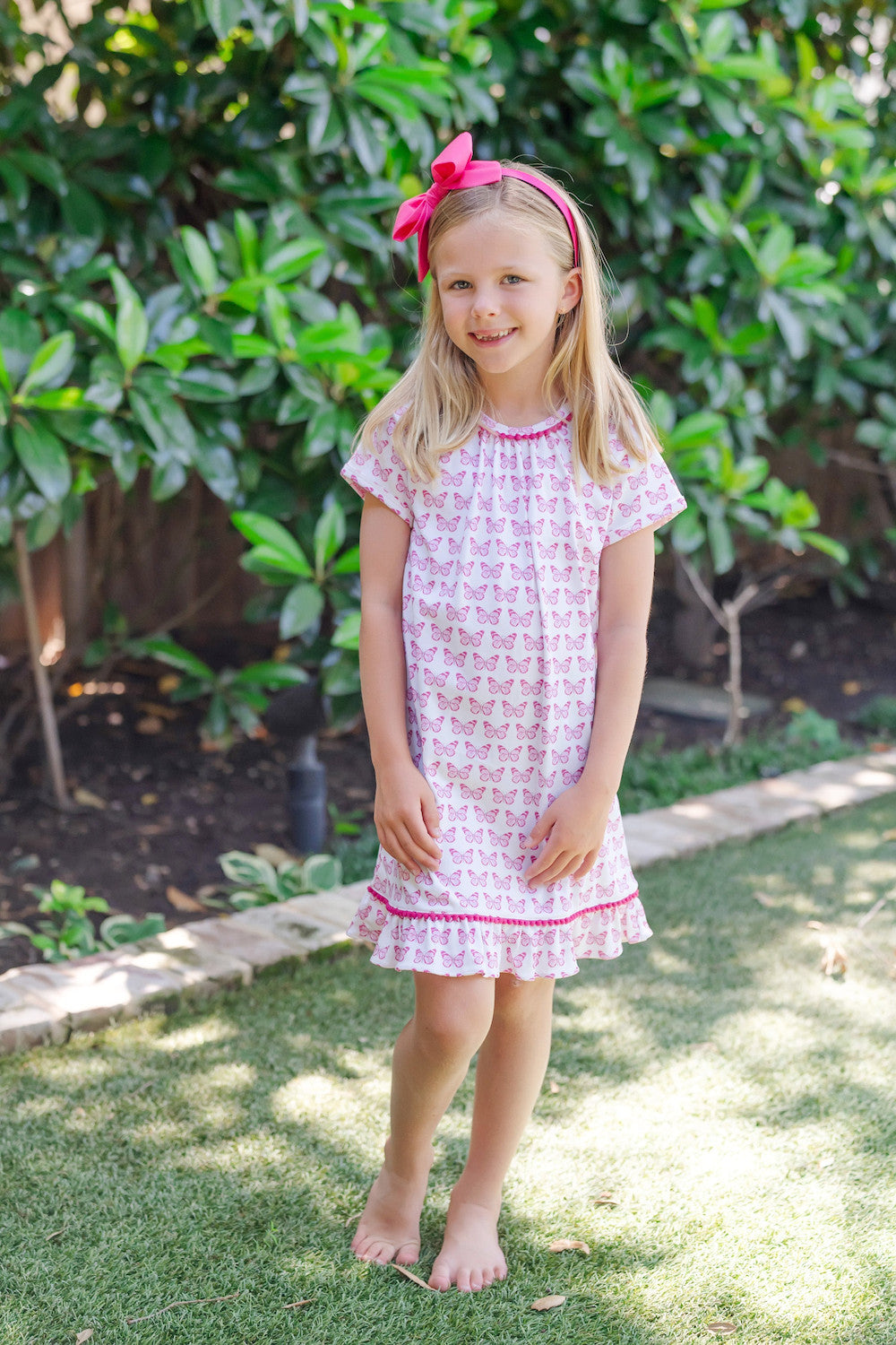 Short sleeve pima cotton dress with flutter ruffle hem and pom pom trim. Button closure at back of neck.