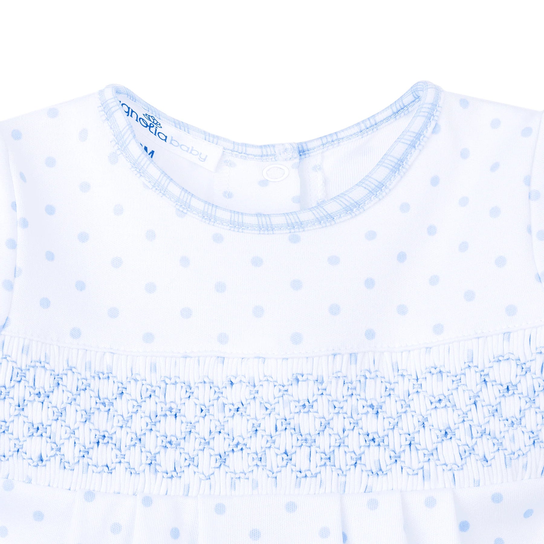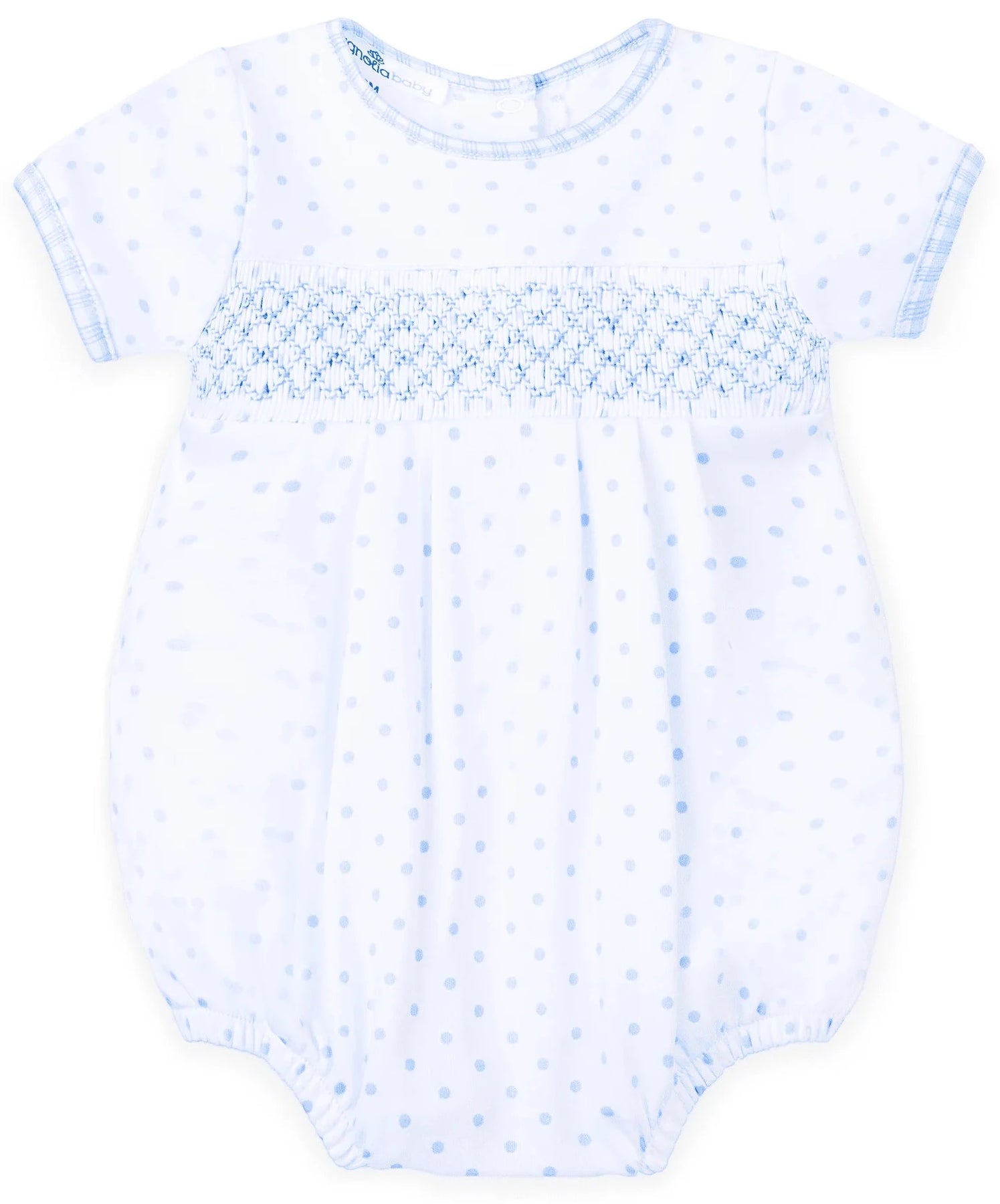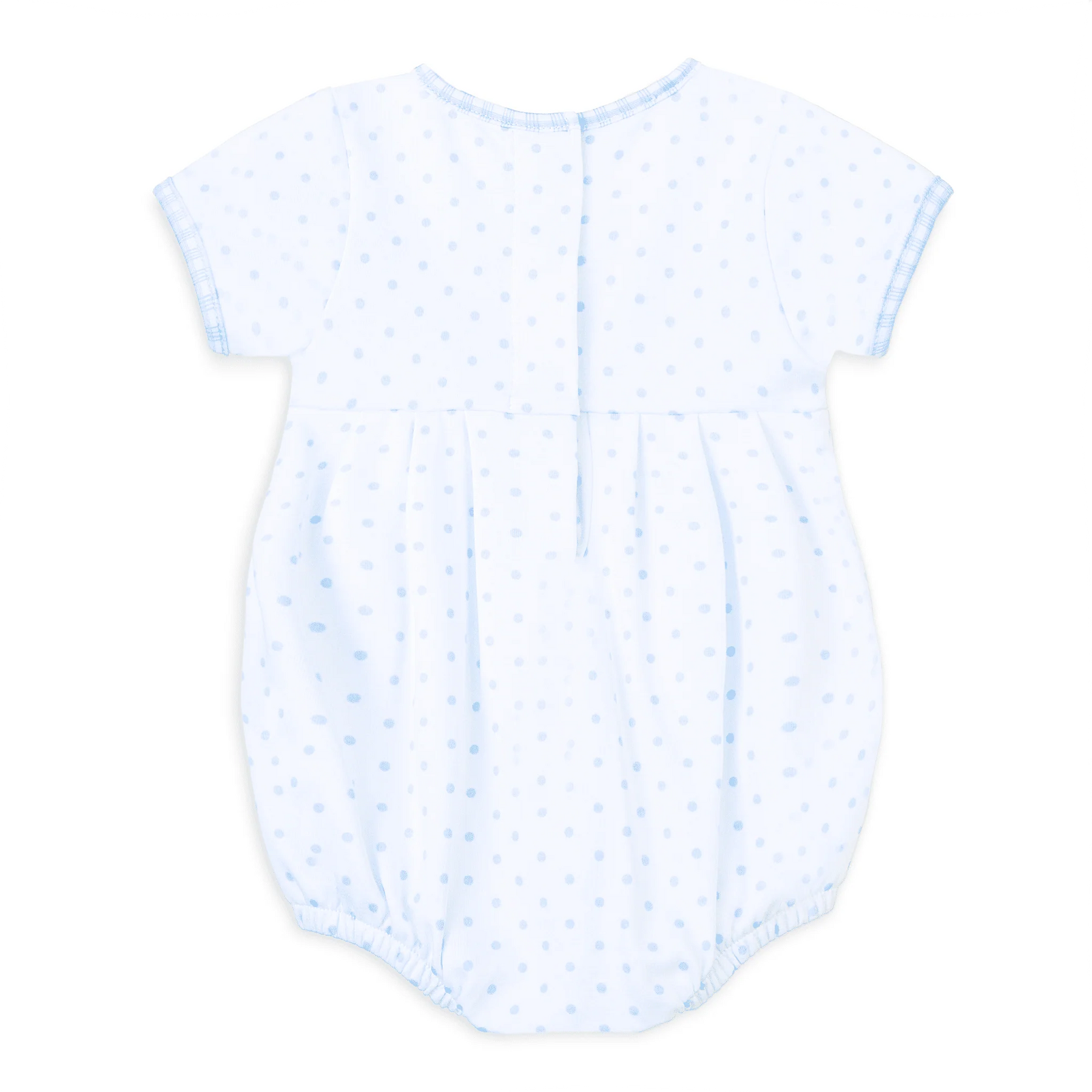 An enchanting short sleeve bubble for a sunny day, crafted from our luxurious Pima Cotton. It features a sweet light blue dot print and a smocked chest panel, providing a soft and airy fit with a snap closure for convenience.