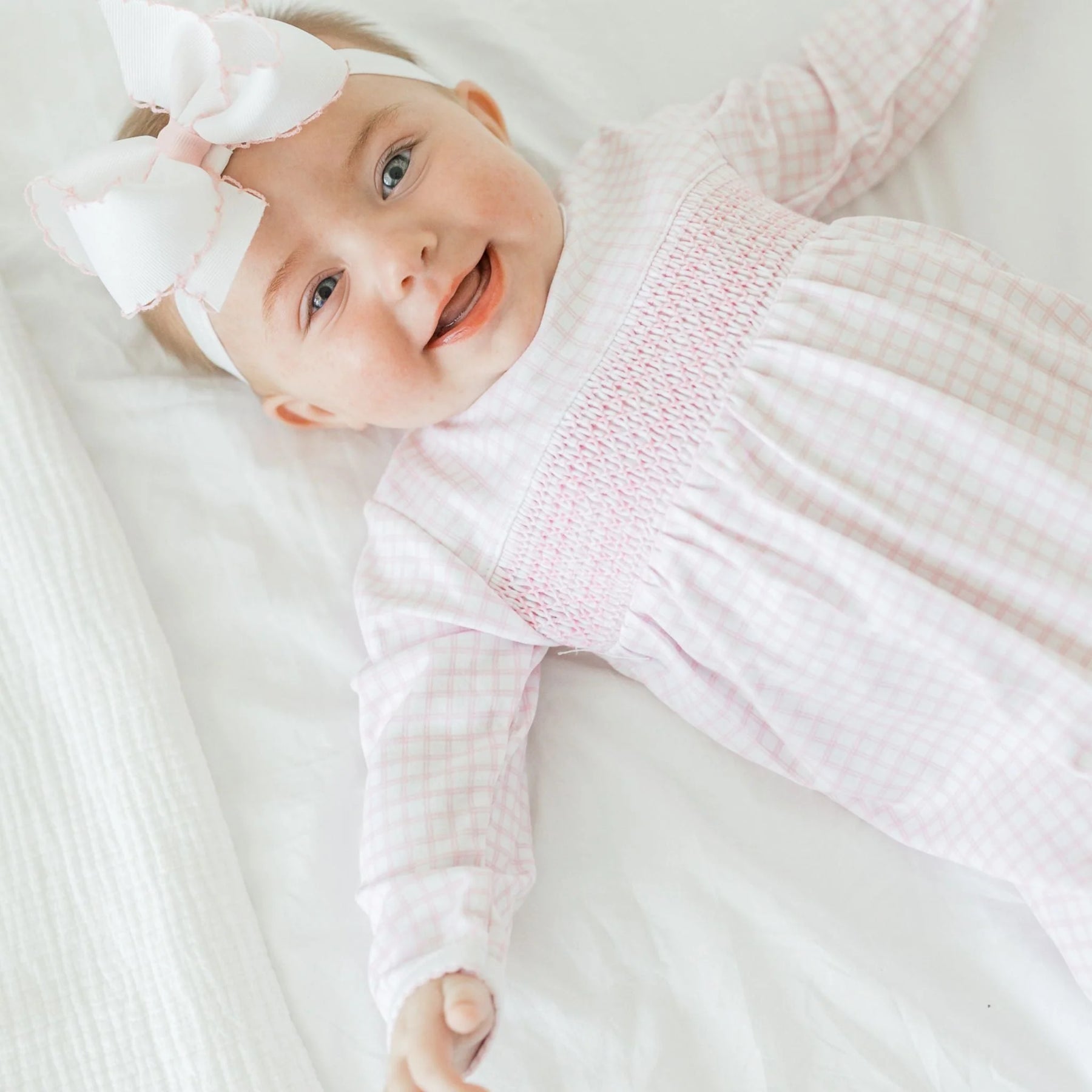 Highlighting elegant comfort with our Peek-A-Boo Wishes Smocked Footie in pink, crafted from the most luxurious Pima cotton. This adorable footie features charming hand-smocked detail, delicate pink picot trim, and a sweet check pattern, perfect for spending quality time with family, visiting loved ones, a delightful first adventure at the park, featuring a beautifully smocked bodice.