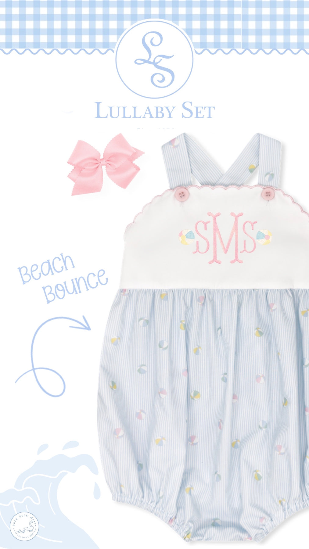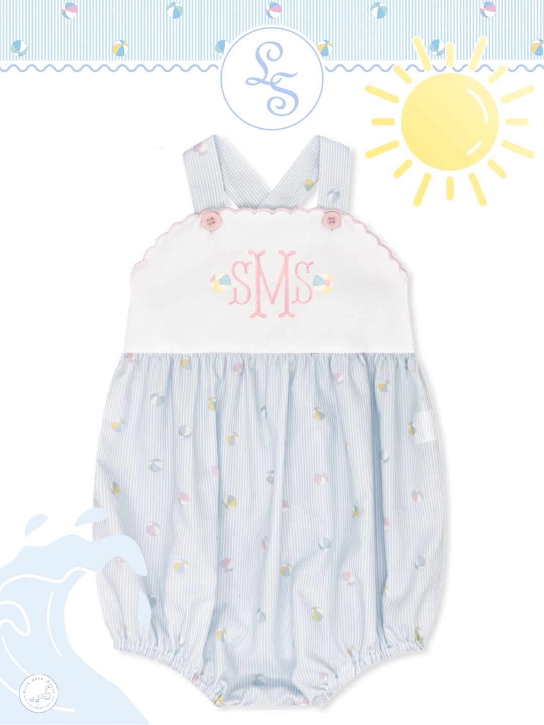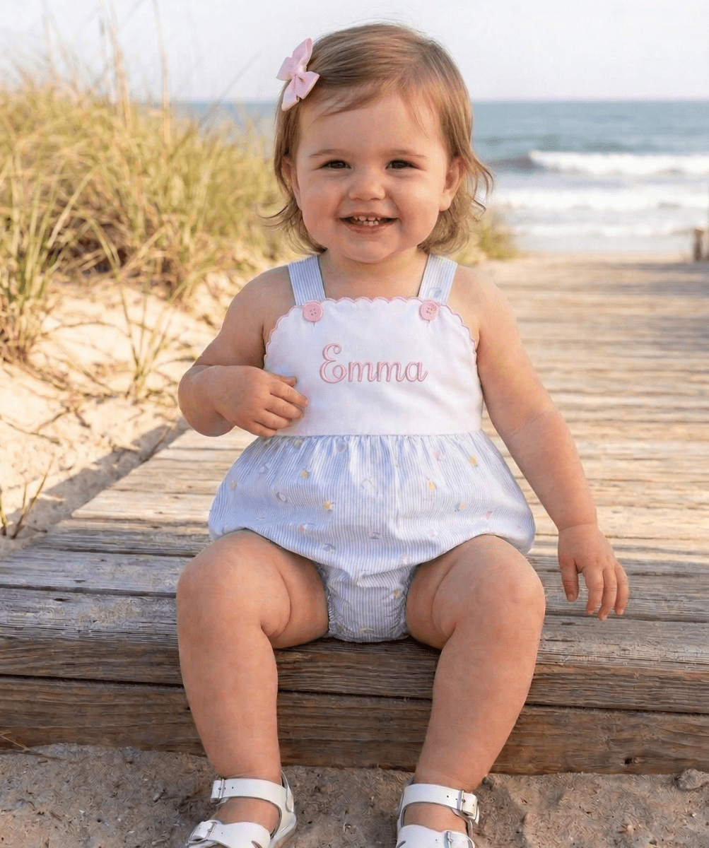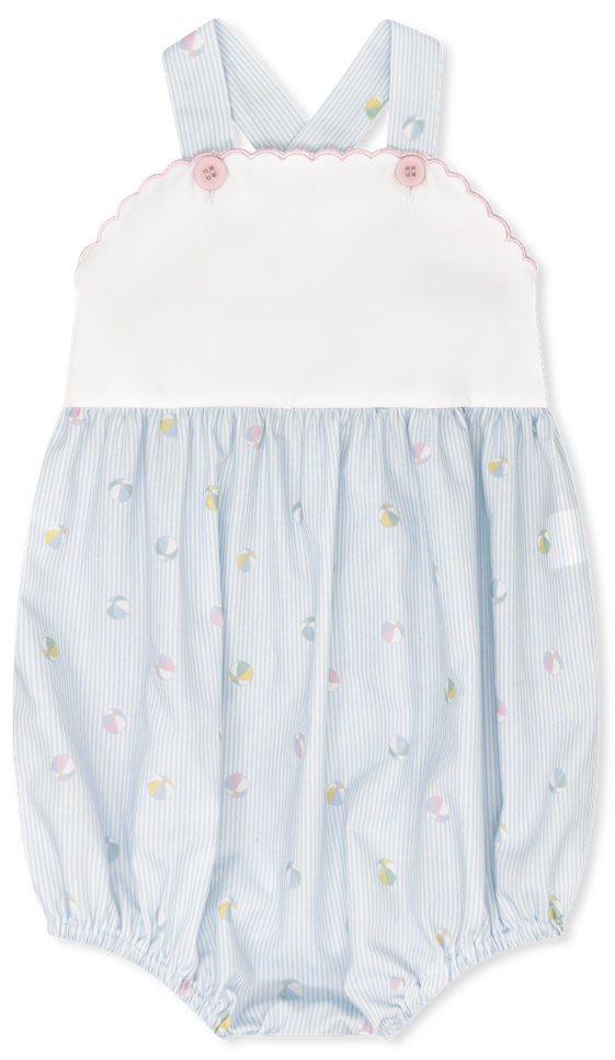 Featuring a crisp white top trimmed with delicate pink embroidery and matching pink buttons, this bubble is finished with a playful Beach Bounceprint on the bottom. Designed for comfort and cuteness, it's a summertime staple your little one will love.